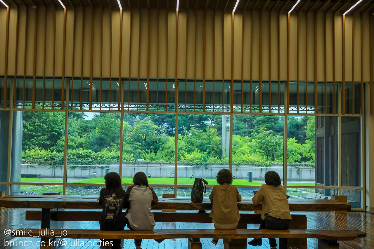 1층 2층 휴게시설도 보고 2층 커피점으로 갔어요. 커피를 마시면서 잘 보이는 입구에는 많은 견학온 학생들과 박물관에 관심 있는 분들이 줄줄이 입장하시는 게 보였어요.