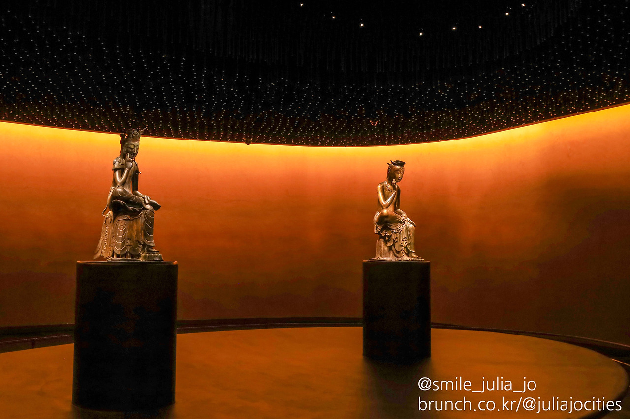 그래서 1층 안쪽으로 들어가면 경천사 10층 석탑과 2층 사유의 방에 반가사유상은 기본으로 관람하며 사진은 카메라바디에 24-105mm 렌즈로 찍었어요. 모드는 AV, 조리개 F값은 4.5에 놓으면 셔터속도는 자동으로 맞춰주는 반자동이에요. 24mm, 50mm, 70mm로 활용했고요. 줌렌즈 기능이 있어도 활용하지 않고 습관대로 내가 움직이며 사진에 담았어요. 초점은 강조할 부분이나 밝은 부분에 주로 맞추고 사진 촬영했고요. 망원렌즈를 가져왔더라면 사용했을 듯했어요.