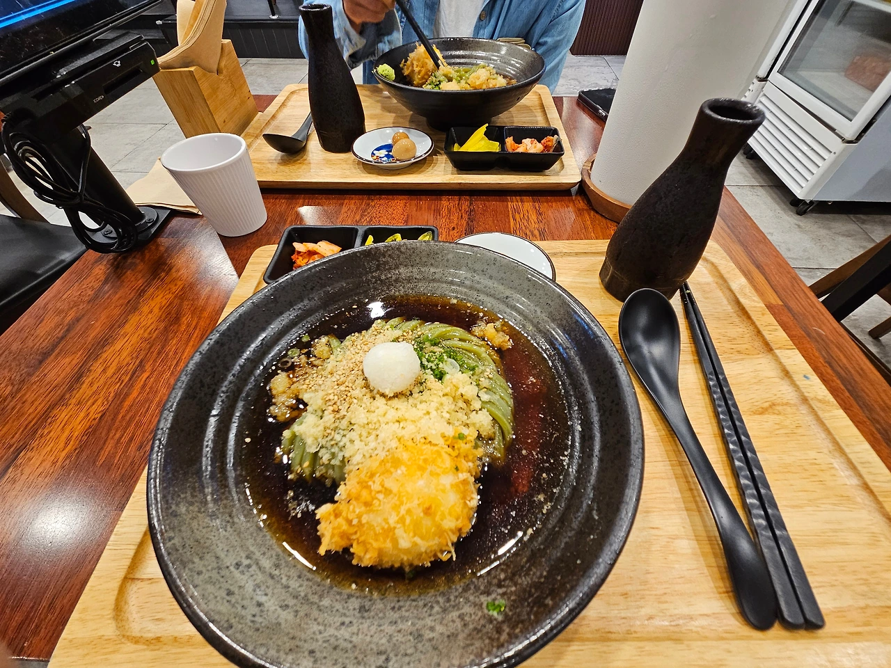 그래서 제주공항에서 가까운 숙소에서 잠시 쉬었다가 저녁시간에 맛집 탐방을 나갔어요. 제주 동문 재래시장에서 멀지 않은 미담 우동를 찾아서 갔어요. 후루룩 뜨거운 국물이 아니었어요. 쫄깃한 초록색 국수에 찬 육수를 말아서 먹는 독특한 맛이었어요. 그리고 반숙 계란이 한 개 튀겨서 장식한 모양이었어요.