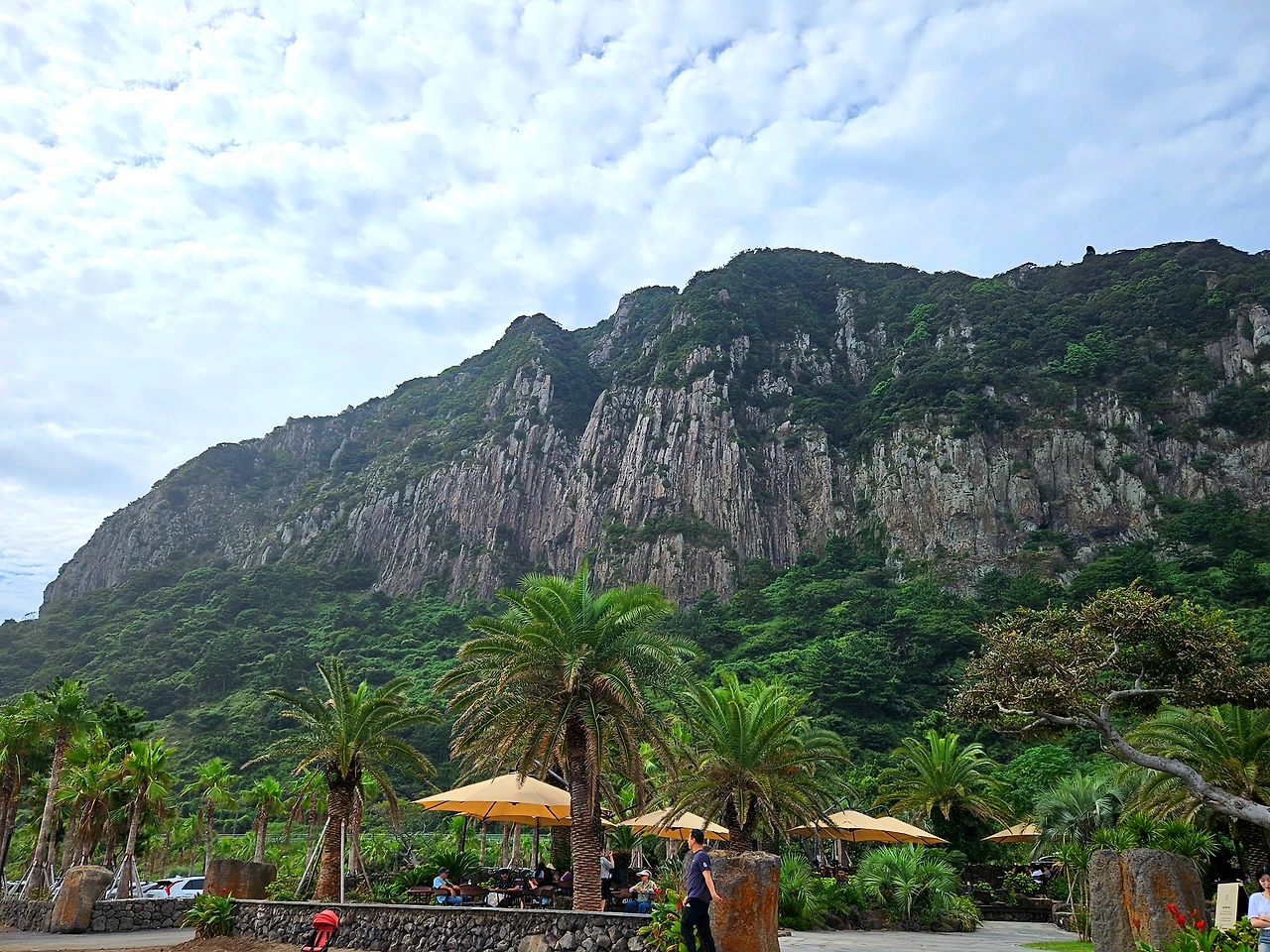 그리고 차로 이동했어요. 서귀포에서 서쪽으로 가까운 이 카페에 가서 보니 산방산이 그야말로 카페 바로 앞에 높게 가까이 보이고 바닷가도 바로 앞에 있는 지역에 위치한 곳이었어요.