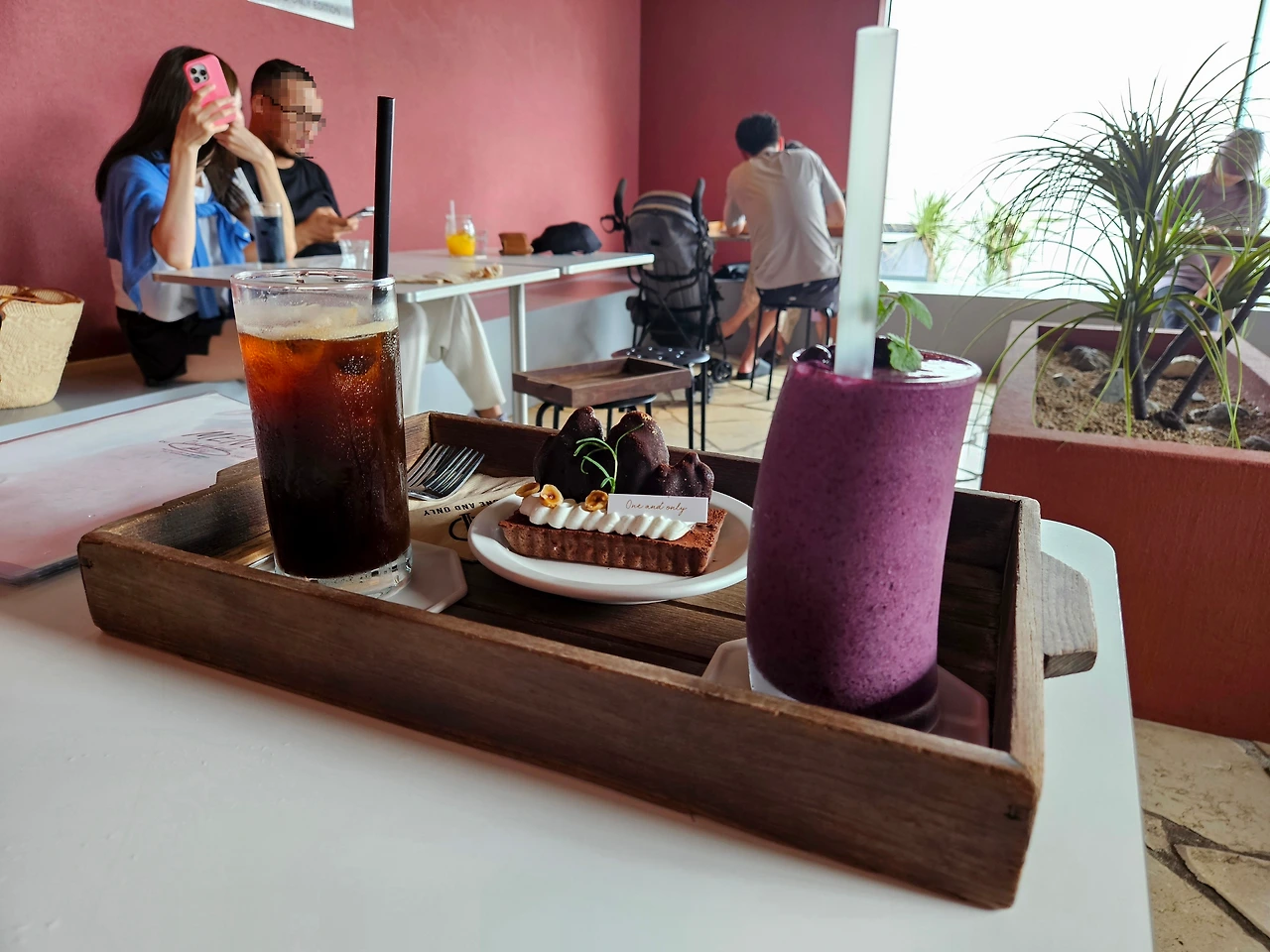 야자나무가 줄지어서 멋들어진 붐비는 주차장을 지나 카페 실내는 자리가 없었어요. 카페 밖에 넓은 곳에 있던 테이블에 앉아서는 야트막한 바닷가도 잘 보였어요. 뜨거울 정도였던 날씨였어요. 덥지만 않다면 더 좋을 듯했어요. 카페의 건물 밖에 테이블과 의자는 더운 날씨 때문에 오랜 시간은 힘들어서, 자리를 기다리다가 실내로 이동했어요.
