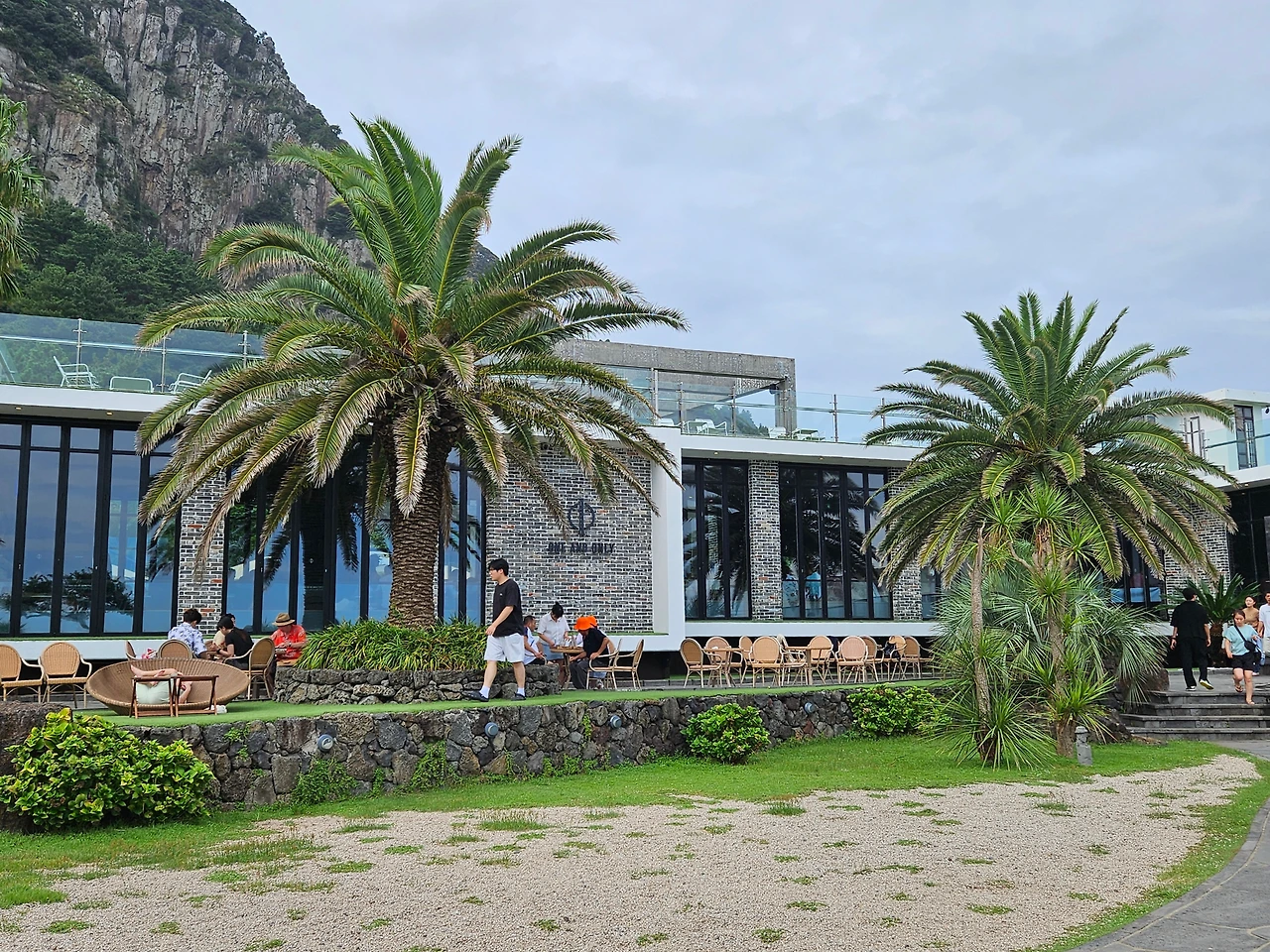 카페 실내에서 보니 점심시간이 지난 시간이라서 손님들은 많았어요. 커피나 음료수를 주문해 놓고 20분 이상 기다려야 했어요. 대부분이 서로 익숙한 가족동반 여행객인 듯 보였어요. 카페 뒤에는 바로 산방산이 가까이 보이고 카페 건물 앞에는 예쁜 바닷가여서 입지조건이 아주 좋아 보였어요.
