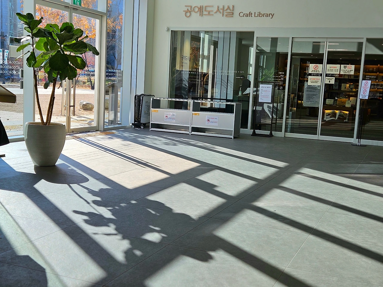 공예로 짓는 집이라는 예쁜 글씨를 보면서 안으로 들어가 보았어요. 1층은 안내와 휴식 공간만 있는 듯 깔끔했어요. 창문으로 들어오는 햇빛이 그림자를 만드는 모습도 보였어요.