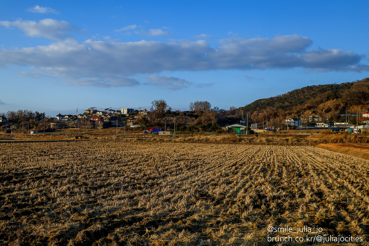 봄에는 모내기등 볼 수 있고요. 여름에는 온통 짙은 연둣빛으로 넘실대고요. 가을에는 벼농사 추수를 볼 수 있어요. 겨울의 따뜻한 날 모습도 포근하고요. 이곳도 산으로 넘어가는 해 일몰을 볼 수 있는 좋은 위치의 장소이더라고요.