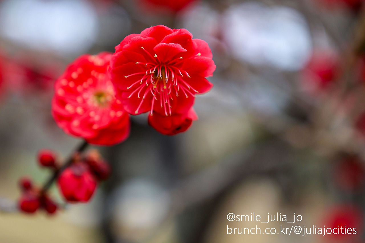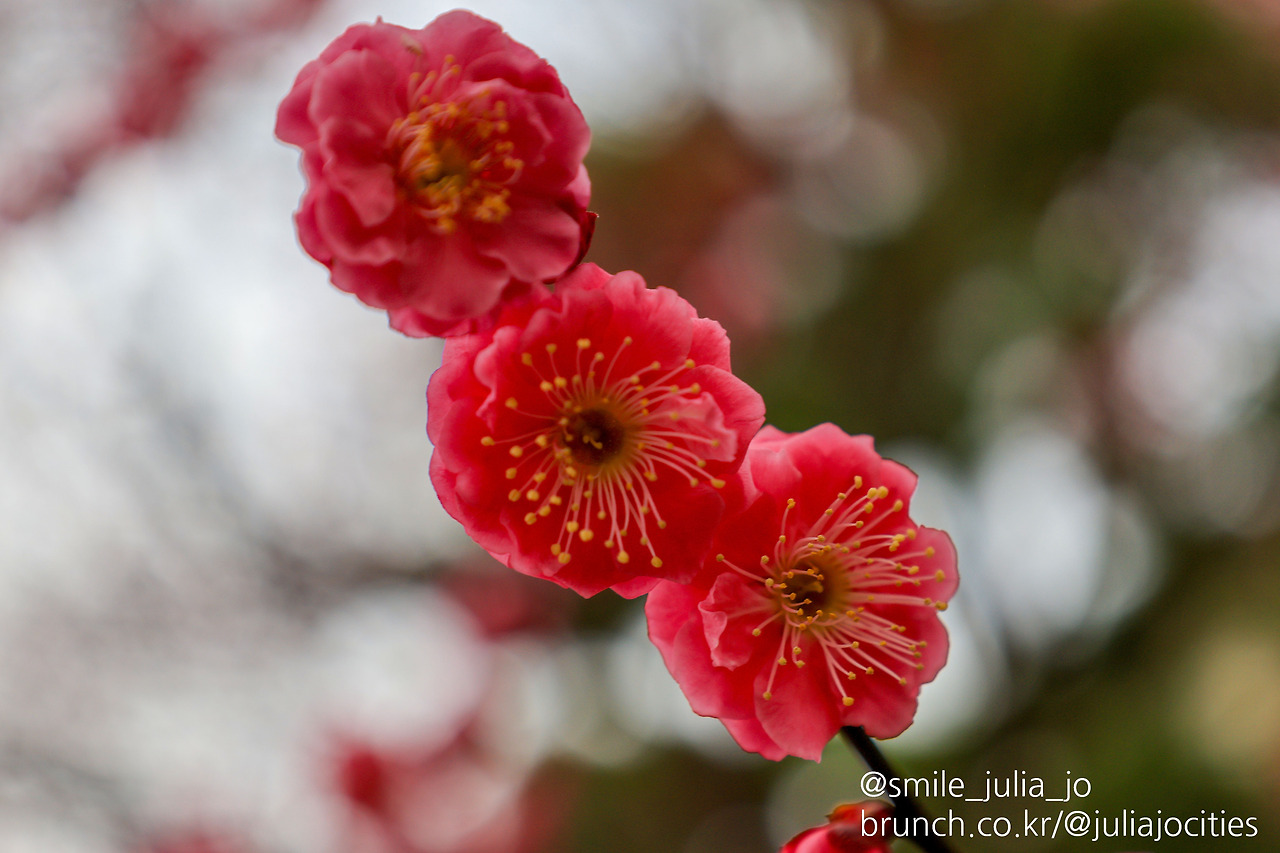 3월 중순이면 70~80퍼센트는 피어서 축제 일정도 잡는 건데, 올해는 기온이 오르지 않고, 쌀쌀한 날씨 때문인 듯했어요. 이미 준비하고 있던 광양 매화마을에 방문객들이 적어서 축제도 진행이 어려웠을 듯 보였어요. 살짝 실망한 일행이 사진을 찍기에도 안성맞춤이 아니었어요.