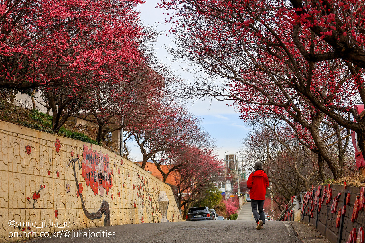 20분 정도 마을을 통과하며 걷고 걸었어요. 순천지역 옥천교를 지나서 카페 사운즈 옥천까지 걸어가 보니, 저수지부터 물이 흐르는 무슨 천에 징검다리도 있고, 한그루의 홍매화가 카페 담장 안 높은 위치에 잘 보였어요. 이미 인스타그램에서 사진을 보았었어요.