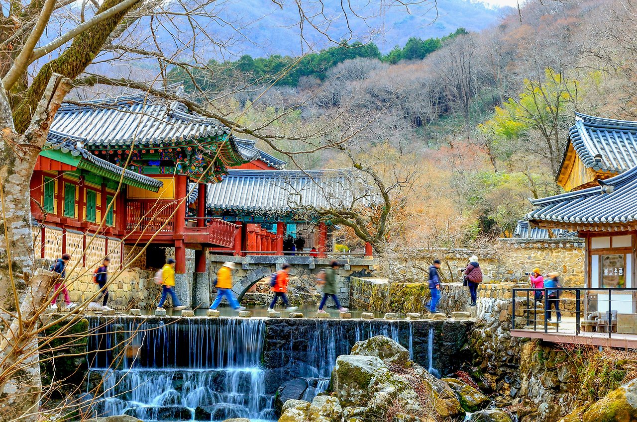 다시 버스로 1시간 10분 정도 이동해서 송광사로 갔어요. 버스가 주차장에서 우리 모두를 내려주고서 카메라 들고 20분 정도 걸었어요. 주변에 나무들이 아직도 겨울나무 같이 보였어요. 드디어 절에 도착해서, 전경도 보았어요. 거의 중심위치에 살짝 폭포처럼 내려오는 물줄기 그리고 징검다리가 눈에 띄었어요. 비가 많이 온 후에는, 더 멋스러운 장소가 될 듯했어요.