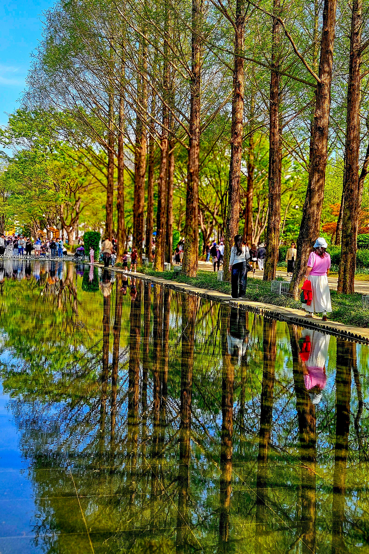 직사각의 얕은 연못에 근처의 나무, 사람 모습이 반영되는 거울 연못을 사진 찍다가, 망원렌즈가 없는 걸 알고서 너무 당황했어요. 부랴부랴 뛰어서 군마상 앞에 한가한 벤치로 다시 갔어요.