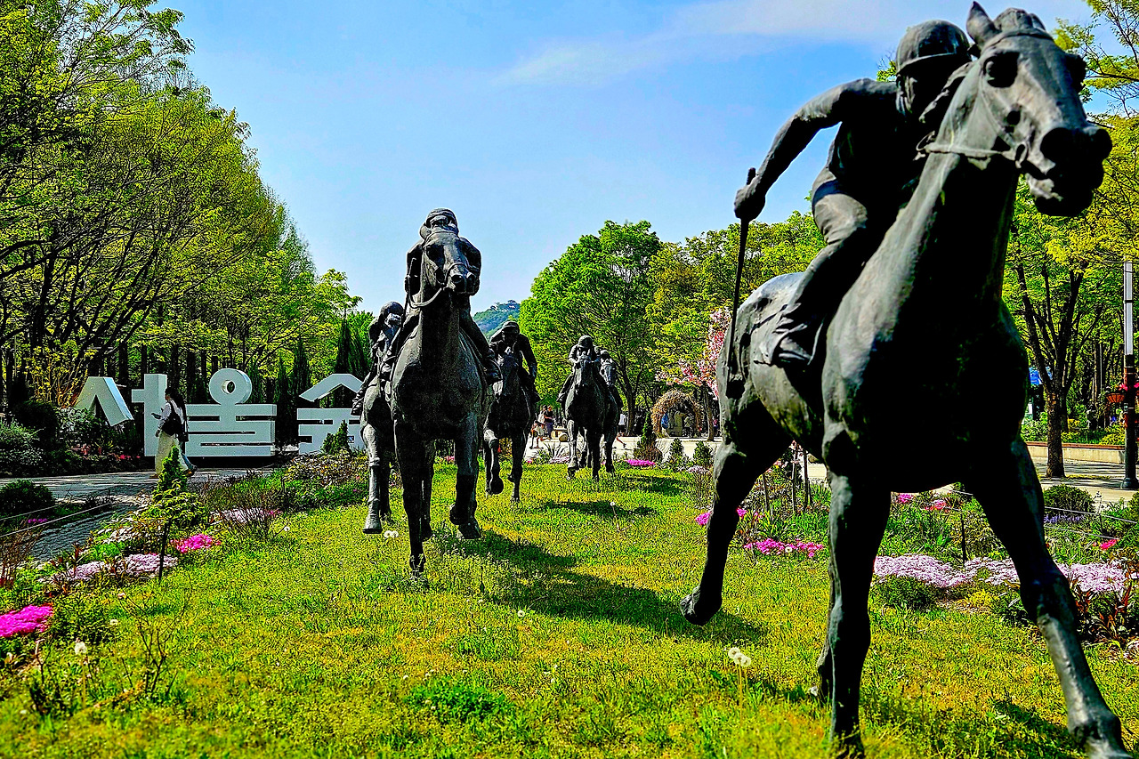 다시 서울 숲 군마상 앞에 가서 생동감 있게 군마상을 찍어 보려고 했어요. 햇빛을 잘 활용해야 하는데 생각처럼 잘 안되었어요. 그래서 군마상 앞쪽에 제법 벤치들이 한가한 곳에 가서 카메라에 부착되어 있던 망원렌즈를 다시 표준렌즈로 바꾸었어요. 망원렌즈를 포근한 케이스에 넣어서, 벤치에 올려놓은 줄도 모르고, 표준렌즈가 부착된 카메라가 들어있는 배낭을 메고서, 다시 거울 연못이 있는 곳으로 갔어요.