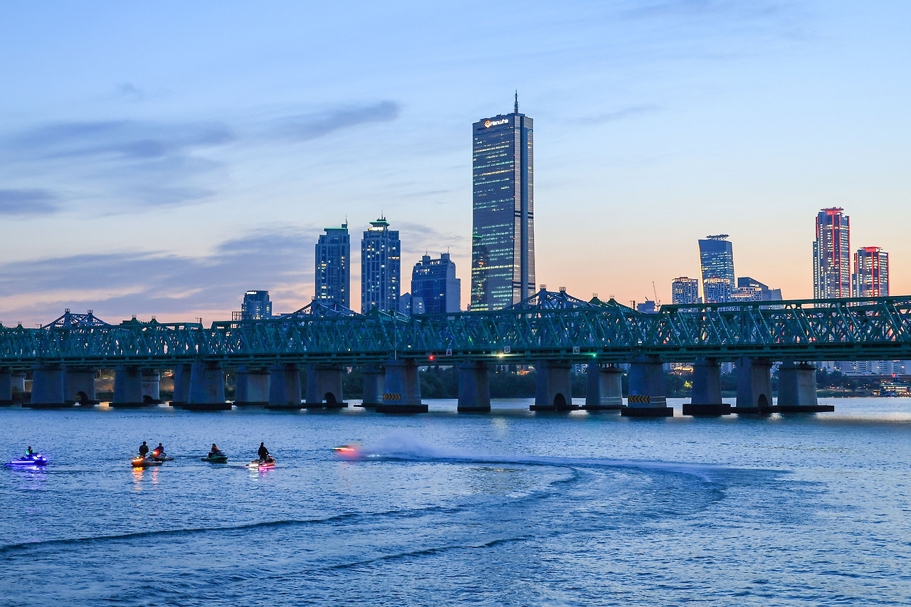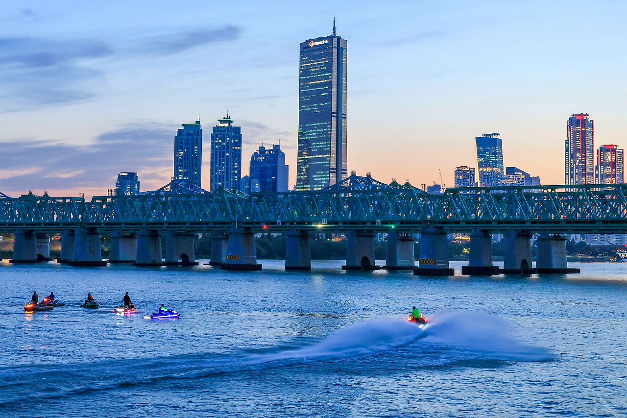 노을감상시간이 살짝 지나면 한강에 제트스키들이 굉장한 소리를 내고서 나타나던걸요. 손님을 태우기 위한 모습인 듯 보였어요.