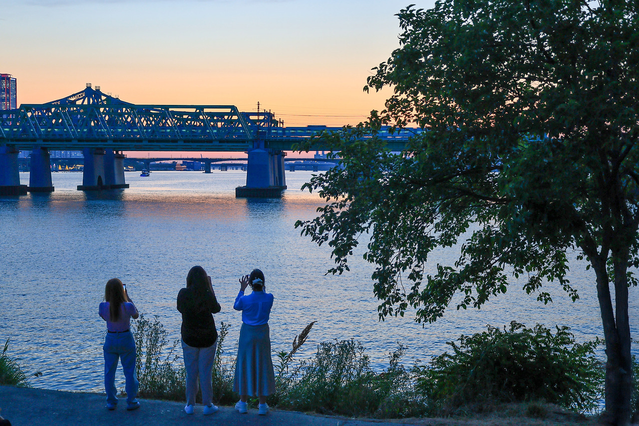 서울 지하철 9호선 노들역에서 한강대교를 건너서 주차장 아래쪽으로 내려가면 바로 그 장소가 노을 명당이더라고요. 어느 곳을 가던지 분위기가 약간씩 다른 걸 보곤 하는데 이 장소는 노을 감상에 진심인 분들만 모여서 감상하는 것 같아요.