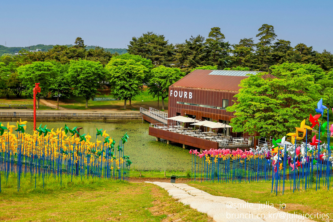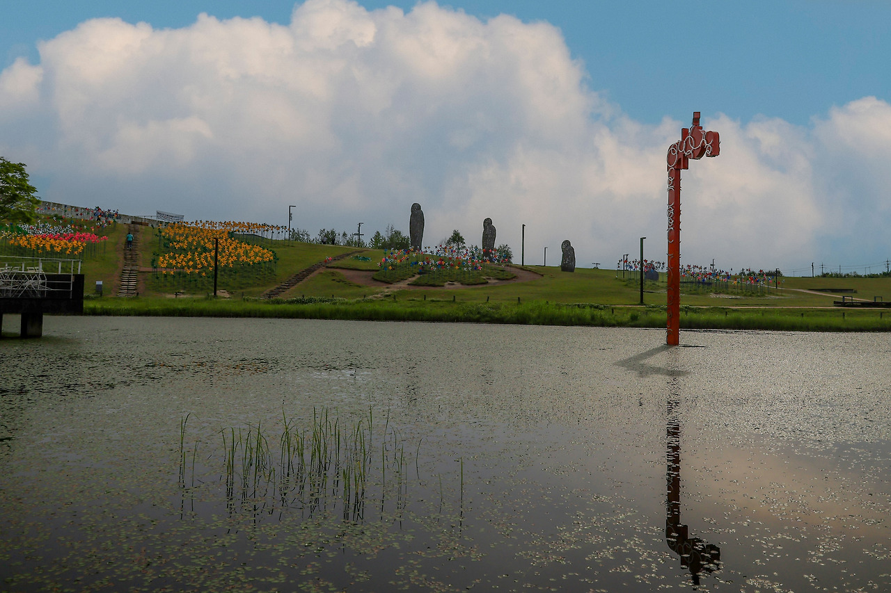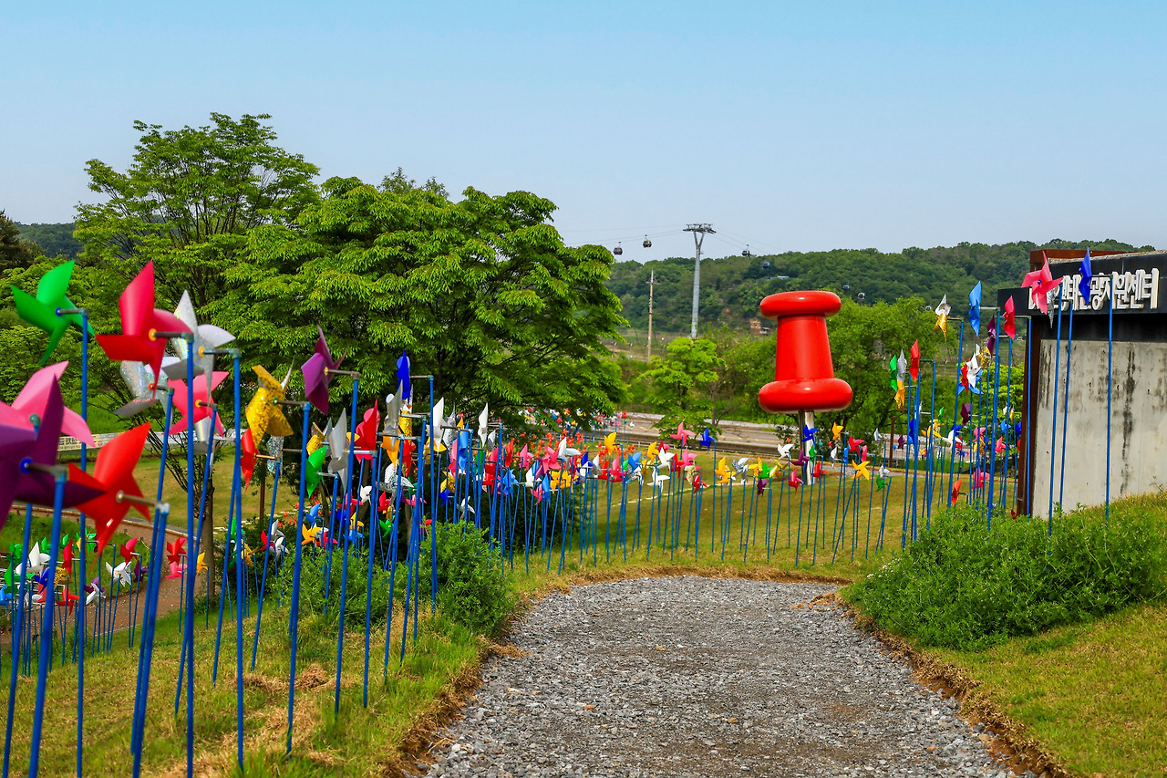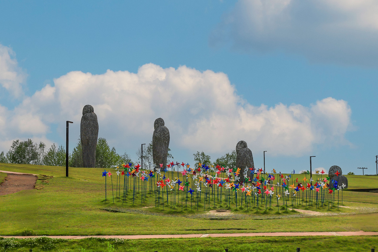 아직 붐비지 않는 시간이라서 바쁘게 사진을 먼저 찍었어요. 그날의 날씨는 바람의 언덕을 오르면서 수많은 바람개비를 보니 돌아가는 건 없었어요. 조용한 아침의 빛이 알록달록 바람개비를 비추었어요.