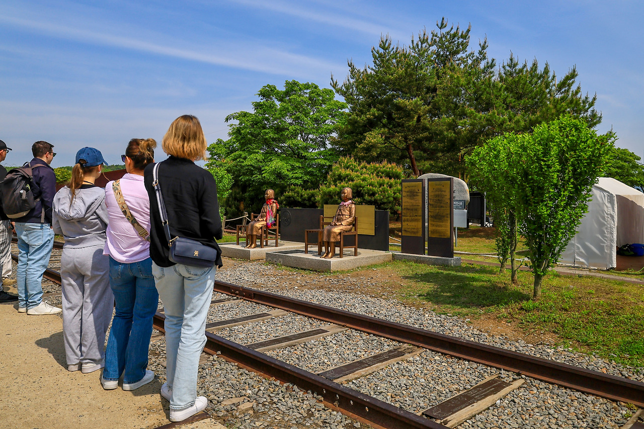 평화누리공원 반대쪽 임진강 독개다리 쪽으로 가기 전에 카페에서 커피와 빵도 먹으면서 얘기도 했어요. 아침 9시가 넘어서 관광버스들 여러 대가 넓은 주차장에 들어오기 시작하던걸 함께 보았어요. 관광객들 사이에 외국인들도 많이 있었어요. 임진각 독개다리 쪽으로 걷고 보고 다시 보면서 다시 걸어 나와서 소녀상 앞에 모여서 설명을 듣는 모습이었어요.