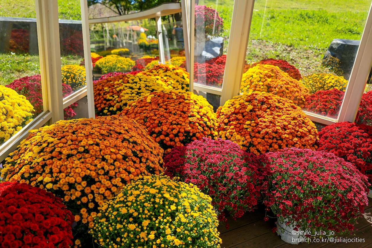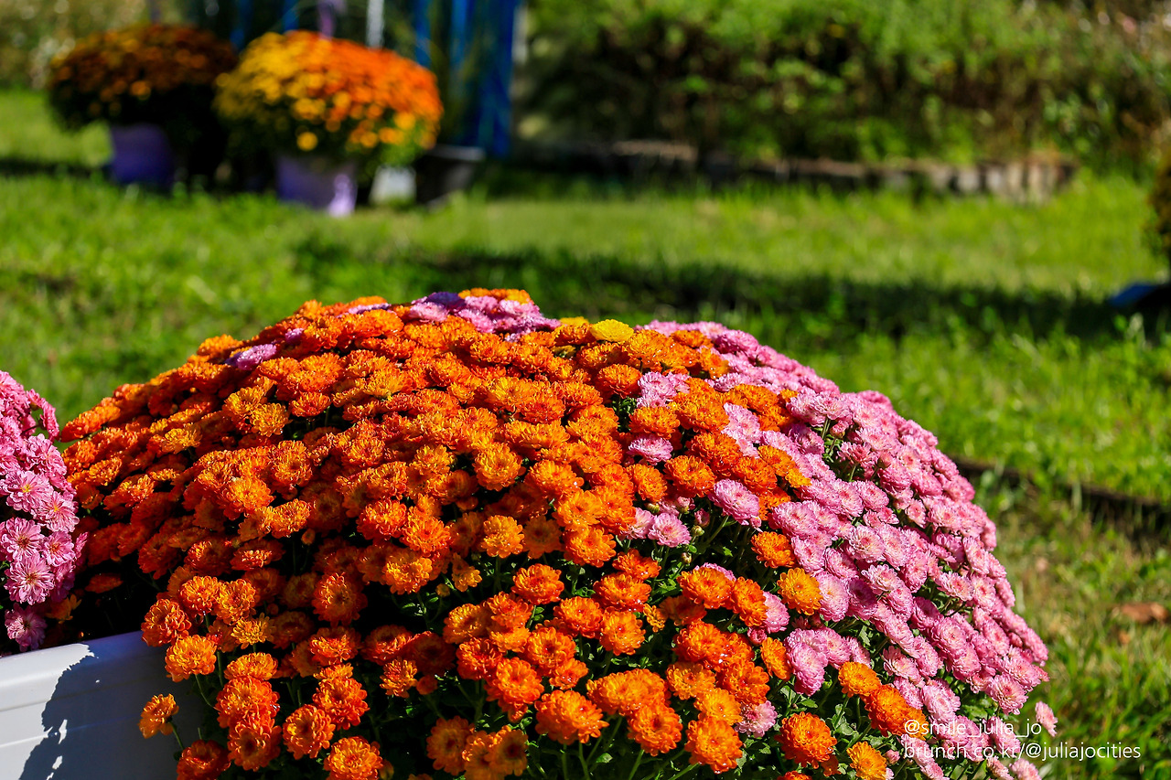 작년보다 국화축제 준비를 더 많이 하는 것을 보았어요. 국화꽃 화분이 1톤 트럭들에 가득가득 실려 있고 많은 분들이 국화 화분을 장식하느라고 일하는 모습이었어요. 여러 종류 여러색의 국화꽃들 감상하기 좋은 계절이며 산책등 걷기도 할 수 있는 장소이기도 해요. 색감이 화려하고 보는 즐거움을 만끽할 수 있어요.