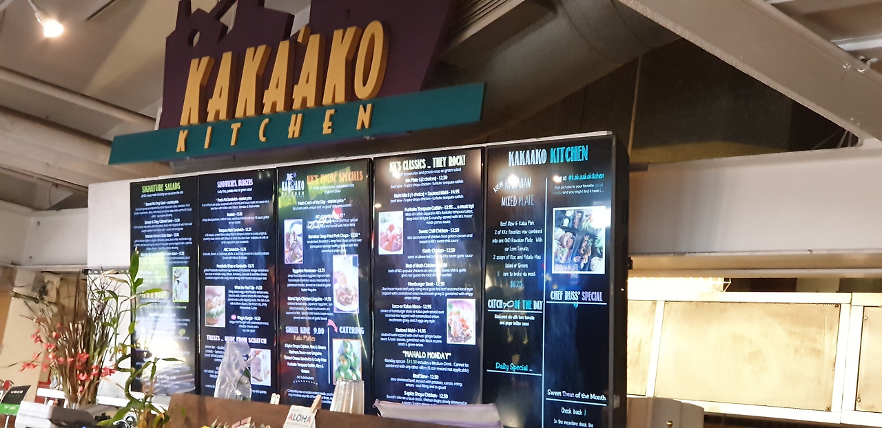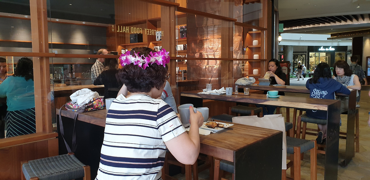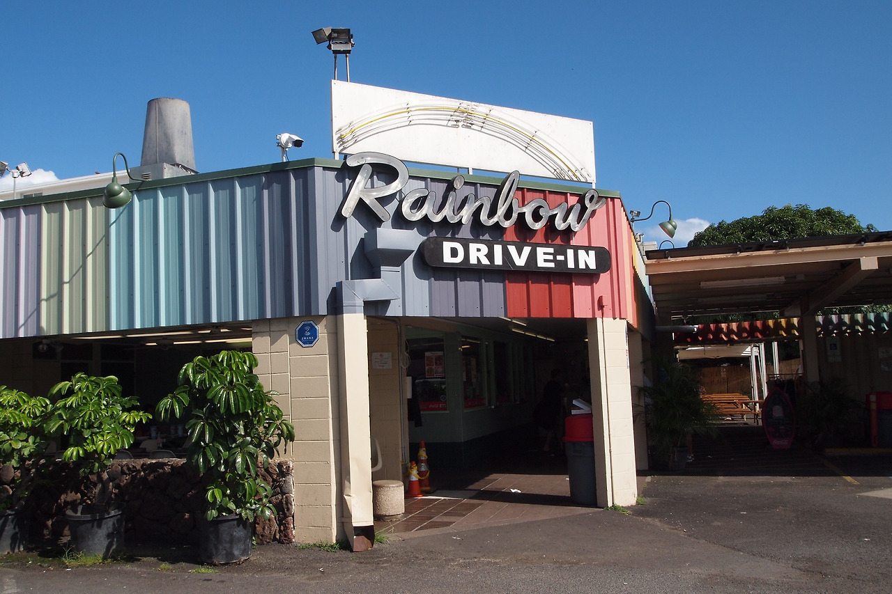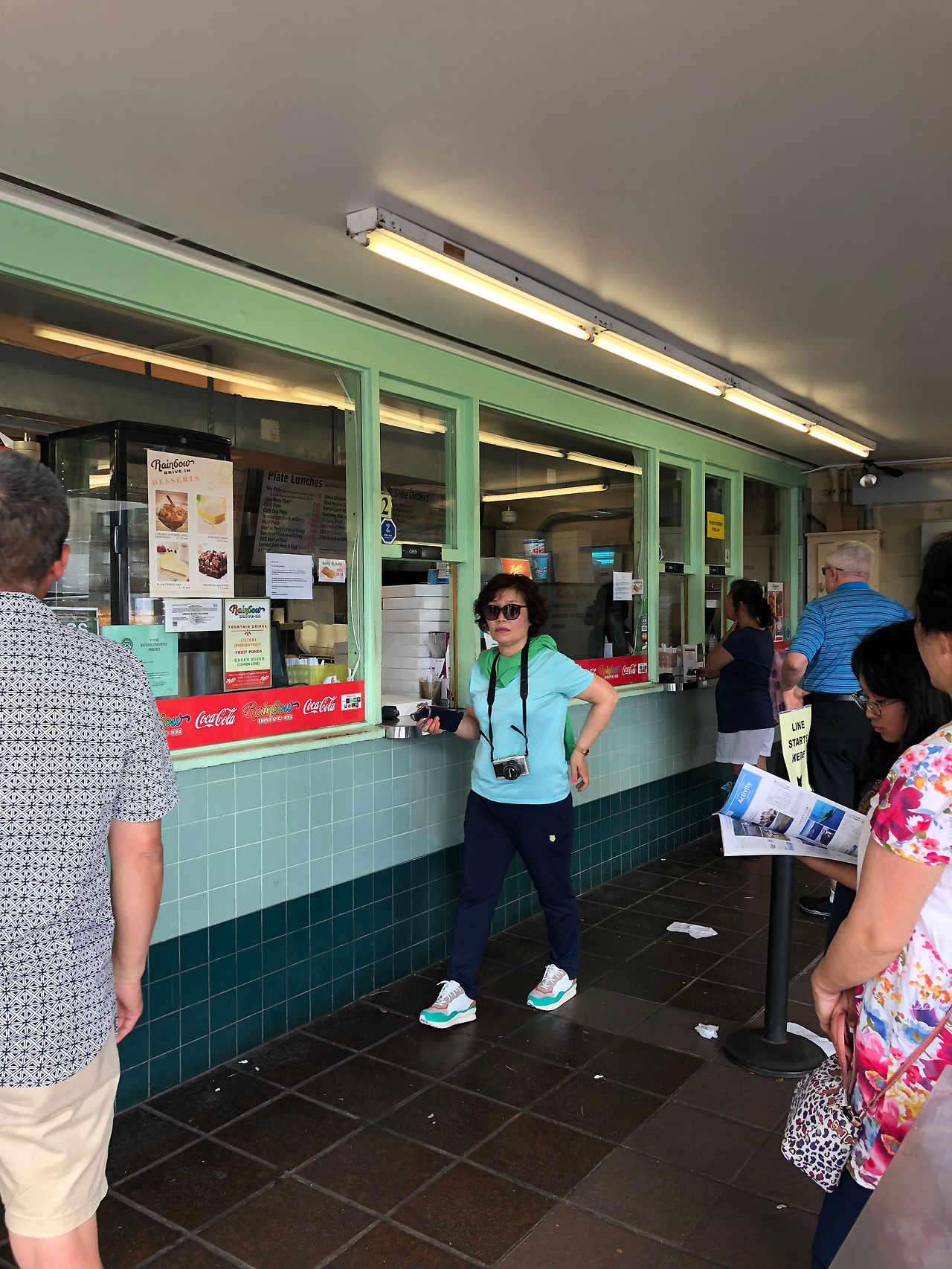 Rainbow drive-in 식당에서 주문하고 있는 모습과 양이 많아 보여서 플레이팅 런치 1인분만 시켜서 둘이서 먹을 수 있었다. 인터넷에 극찬한 음식을 맛있게 먹고 바로 옆 다른 가게로 걸어서 이동했다.