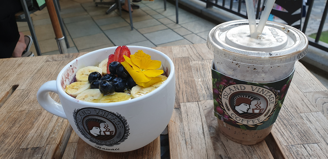 블루베리 요구르트를 살짝 얼린 것 같은 맛에 그래놀라가 믹스되고 바나나, 블루베리, 딸기, 오가닉, 꿀을 올린 아사이볼을 집에서도 만들어 봐야겠다. 살짝 얼린 커피와 믹스된 하와이 카페이다. 아사이 볼이 제일 맛있는 카페라고 한다.