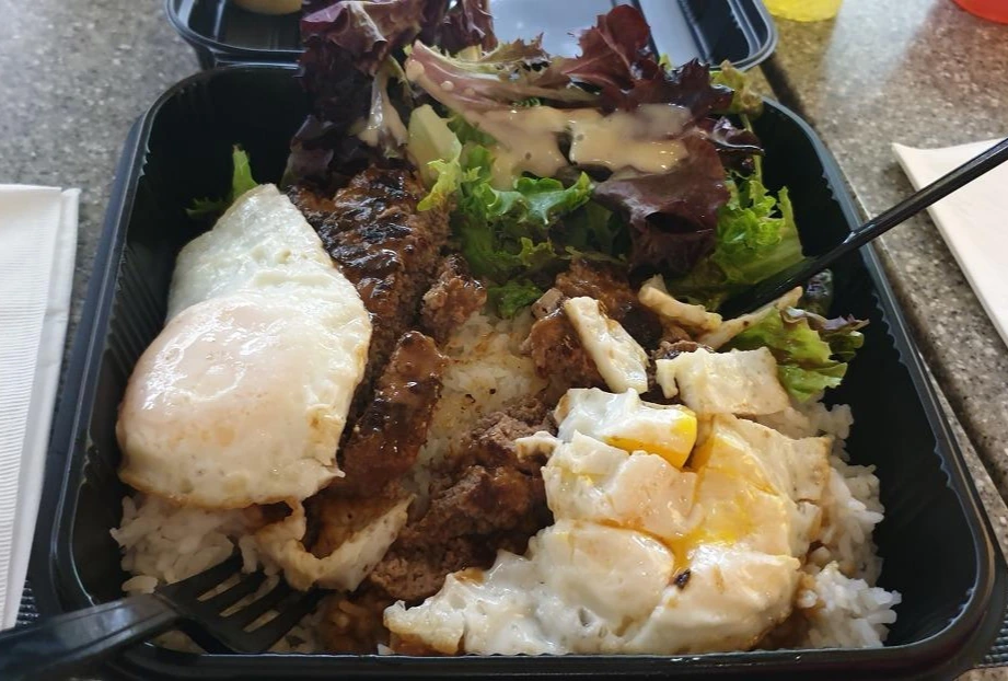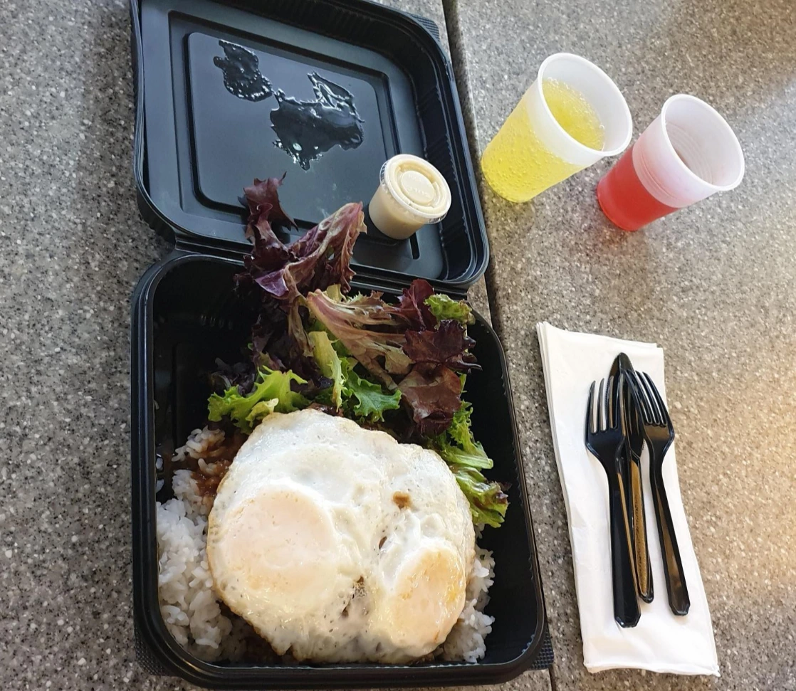 카 카아 코 키친을 찾아가서 맛보았던 로코보코 - 1인분에 계란 2개와 고기의 아래에 밥이 있어서 한국인의 입맛에 알맞게 되어 있었다. 마카로니와 그린 샐러드 중에 선택할 수 있다.