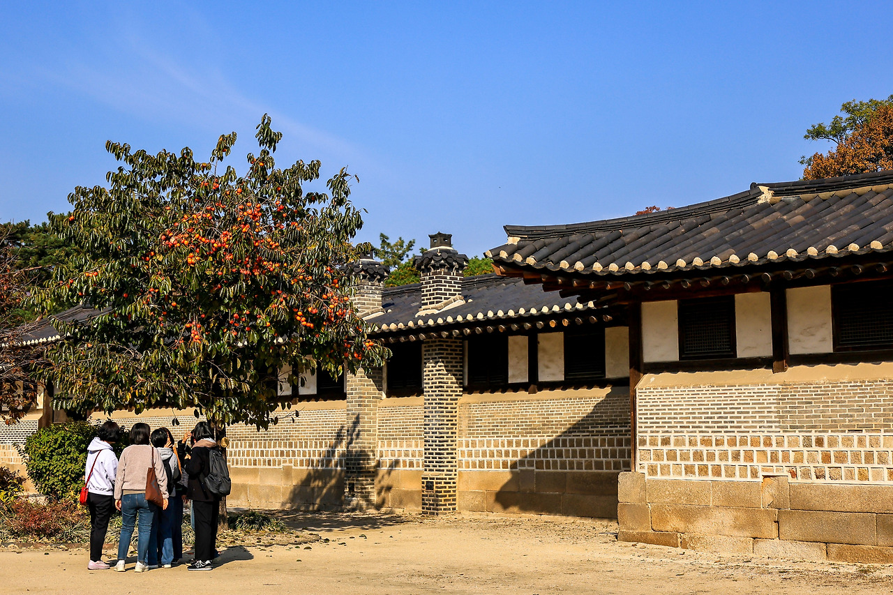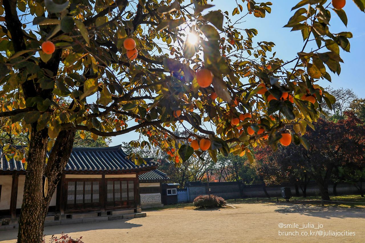 곱게 물들었다가 벌써 떨어지는 은행잎 단풍잎들도 있고, 그 예쁜 모습을 보려고 하는 방문객들도 아주 많더라고요. 바람도 없는 쨍쨍한 날씨 고궁 방문하기에 적당하고 좋았어요. 어차피 입장권이 없어서 후원을 들어갈 수 없어서 낙선재에서 더 사진을 찍다 보니 감나무가 있더라고요. 감나무 잎은 싱싱하지 않았지만 감들은 나무에 예쁜 다홍빛으로 주렁주렁 있던걸요. 지나가다가 '어머 감나무 좀 봐!' 그런 말 한마디씩 하던걸요.