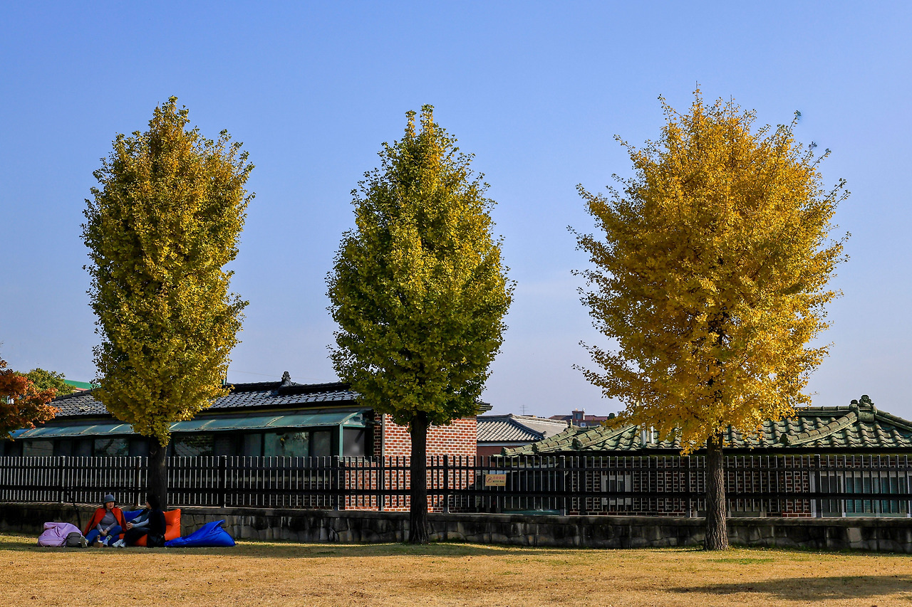 잠시 산책으로도 좋은 앞마당을 지나서 많은 벤치 중에서 골라서 앉아서 점심 도시락도 먹고 나무들 가을색도 감상했어요. 바람도 없고 따사로운 적당한 온도의 날씨였어요. 이곳 정독도서관의 잔디로 가꾸어진 앞마당에 와서 나무들 감상하고 이 계절이 지나면 없을 모습을 카메라 들고 사진에 담았어요.