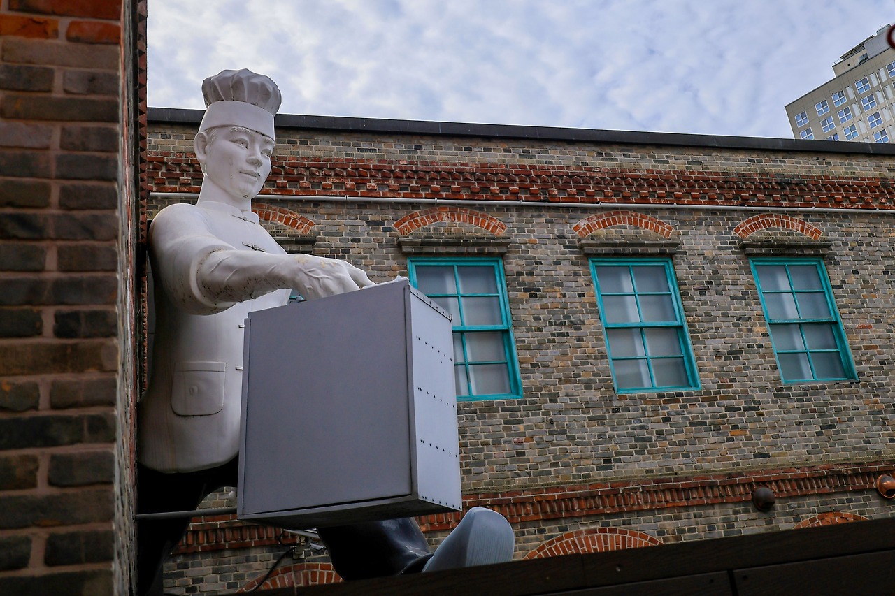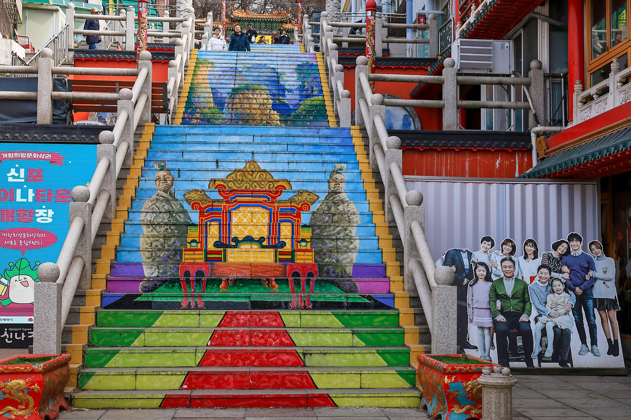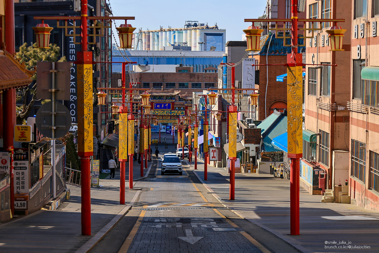 걷고 걸으면서 레트로한 건물의 거리를 감상했어요. 기온이 갑자기 높아진 날씨 때문인지 쌀쌀함은 없더라고요. 간단한 음식도 파는 가게들과 짜장면 음식점 그리고 카페들이 많이 보였어요. 나들이 나온 사람들 표정이 여가 시간을 보내는 모습으로 보였어요.
