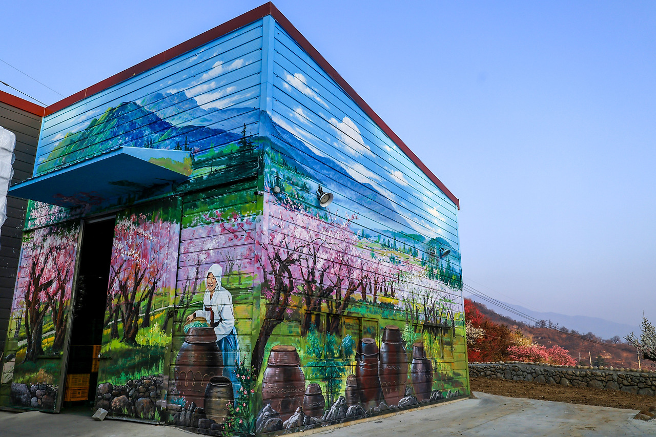 홍쌍리님 그림 속에 있는 분의 시아버지 때부터 이곳 광양매화마을에 매화나무를 심었대요. 홍쌍리 매실청이 성황리에 잘 팔려서 항아리들도 많고 벽화그림의 공장 건물이 있대요. 또 매실청을 전국으로 배송하는 트럭, 차들로 분주하대요. 수출도 잘 되는 걸로 들었어요. 그리고...