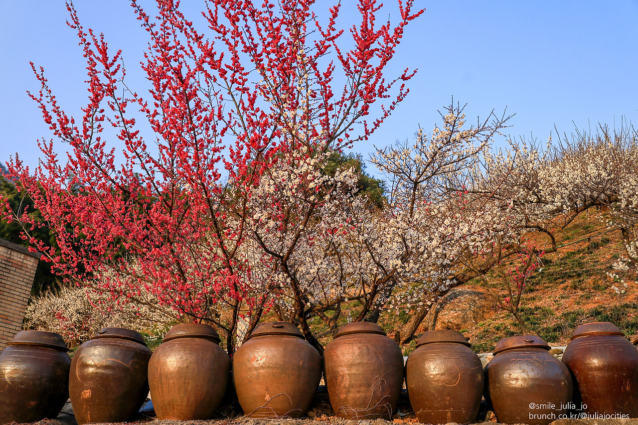 그리고 포장된 도로 위를 걸어서 30분 정도 내려오면서 매화마을에 모습을 관찰도 했어요. 중간중간에 홍매화들도 있었어요. 거의 다 내려와서 만난 홍쌍리 청매실농원이 꽤 크더라고요.
