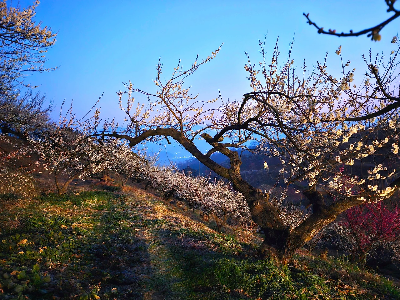 아직 동이 트기 전이라 어두컴컴해서 잘 안 보이고 한분 두 분의 강력한 플래시 불빛으로 한걸음 한걸음 올라갔어요. 올라가서 보니 넓은 산자락에 모두 매화나무가 있었어요. 매화꽃이 약 60% 정도 핀 듯 보였어요.