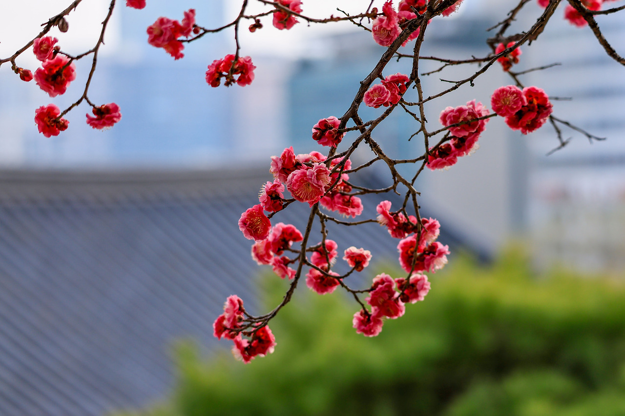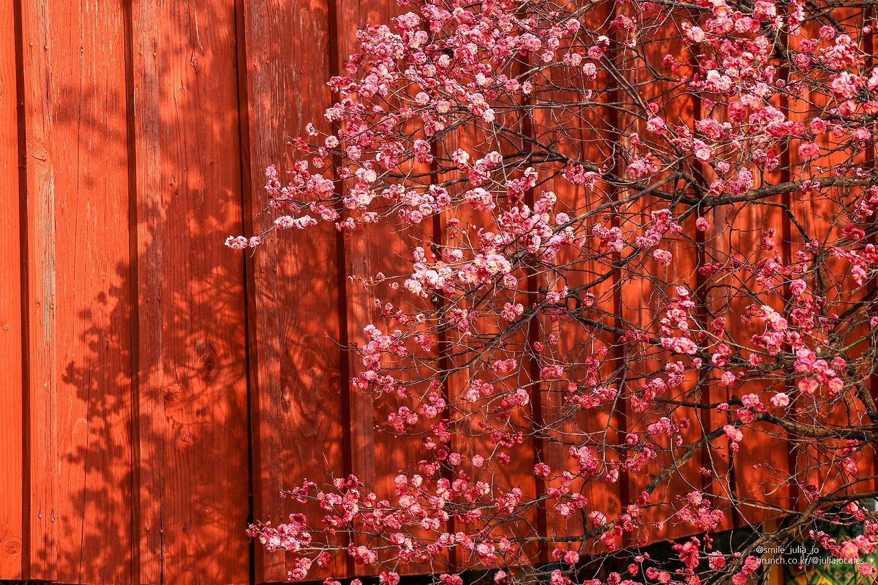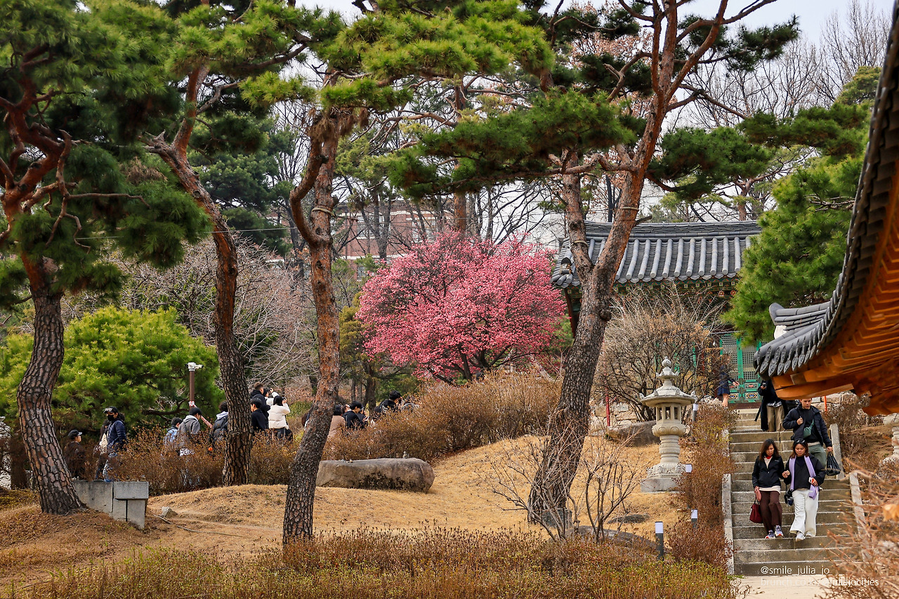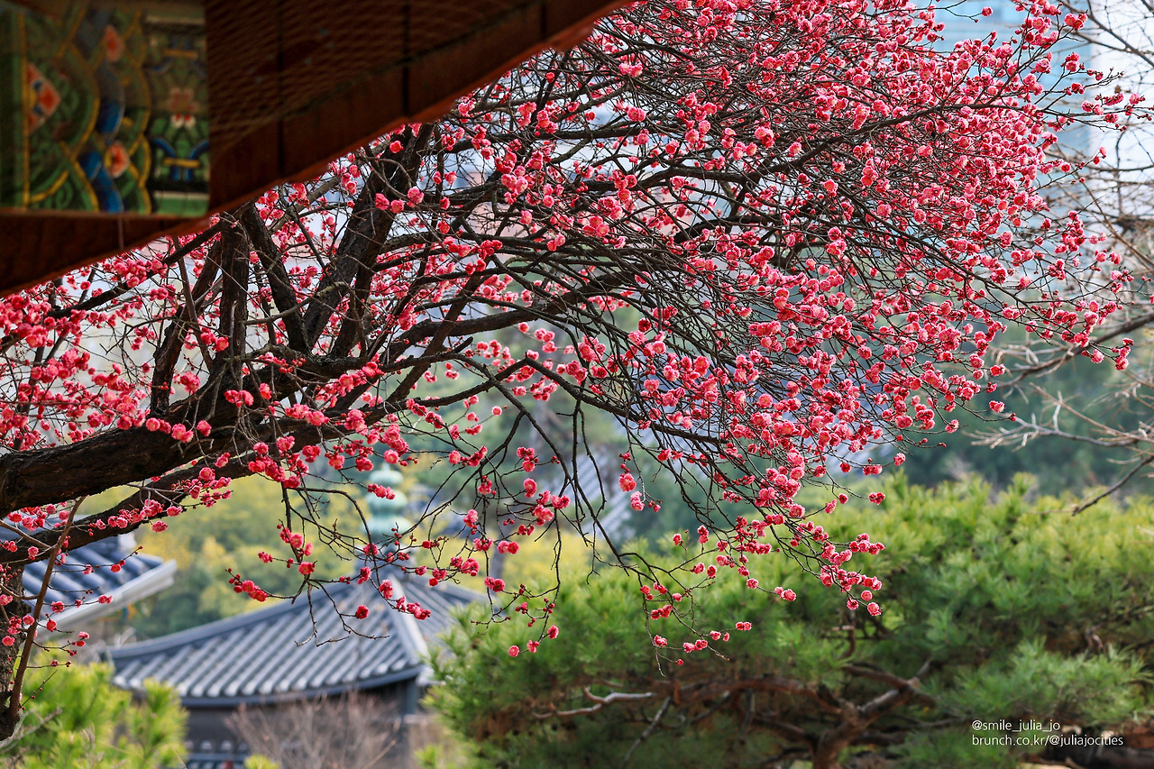 그러면서도 배경에 사찰의 모습이 들어가야 사진에 더 좋기에 사람들을 피해서 요리조리 사진에 담기에 바빴어요. 근처에 산수유나무도 있었는데 아직 개화가 안되어서 사진에는 못 담았어요. 이 나무도 노랗게 되면 다시 와야겠어요. 다시 근처를 다니면서 오늘의 피사체 색감도 예쁜 홍매화를 사진에 담았어요.