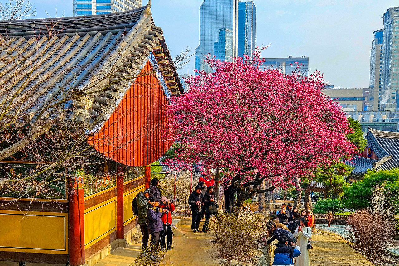 9호선으로 봉은사역에 도착하니 햇빛이 보였어요. 그러면서도 구름이 자주 왔다 갔다 하면서 햇빛을 가리는 걸 보았어요. 역시나 많은 분들이 봉은사의 영각옆에 홍매화를 구경하느라 나무 주위의 사람들로 두 겹의 줄이 보였어요. 전문가용 카메라도 많았지만 스마트폰으로도 사진들을 많이 찍으시더라고요. 이 시기가 지나면 시들어서 떨어질 핫핑크색의 홍매화가 며칠 동안 아주 예쁘기 때문이지요.