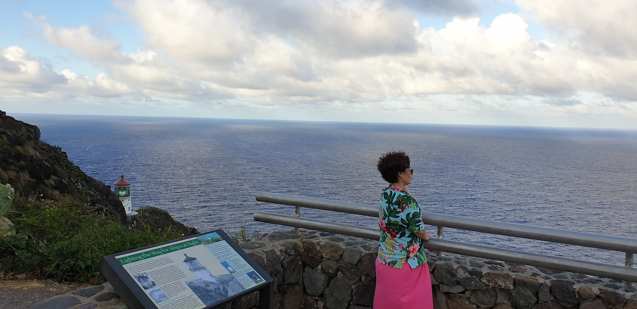 오르막길을 40분 이상 올라가야 등대가 있다고 했다. 중간 정도에서 숨도 가쁘고 지쳐서 쉬며 쉬며 올라갔다. 바람이 상쾌하게 다시 에너지를 불어넣어주었다. 빨간 지붕의 인상적인 등대가 보였다. 그림처럼 아름 다운 전망이 보이고 토끼섬 거북이섬 등 아기자기한 섬들이 한눈에 들어왔다. 아래쪽에 마카푸우 비치는 파도가 좋아 보였다. 짙푸른 바다의 전경을 보고 있는 동안 올라오느라고 힘들었던걸 잊어버리고 말았다.