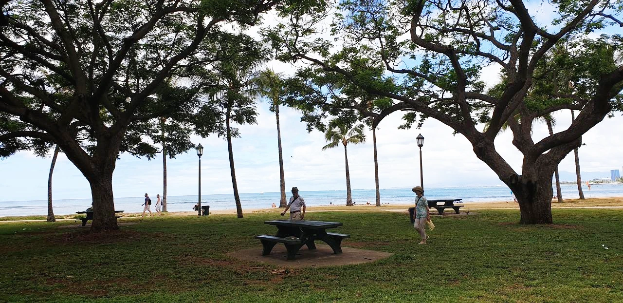 피플스 오픈 마켓도 열리고 있는 덕분에 주차하기는 굉장히 어려웠다. 3바퀴 돌아온 이후에 차를 세우고 기념 공연을 잠시 보며 치즈버거도 구입하고 댄서들도 보고 이 도시의 분위기에 젖었다. 와이키키 해변에는 각각의 이름이 다른 beach가 있다. 동쪽 끝에 카이마나 kaimana beach 한적한 곳을 택해서 수영하고 물속이 훤히 보이는 짠 바닷물에서 놀면서 물고기도 볼 수 있었다. 짠 바닷물이 입술에 느껴졌다. 물안경을 꼈는데도 눈이 따가웠다.