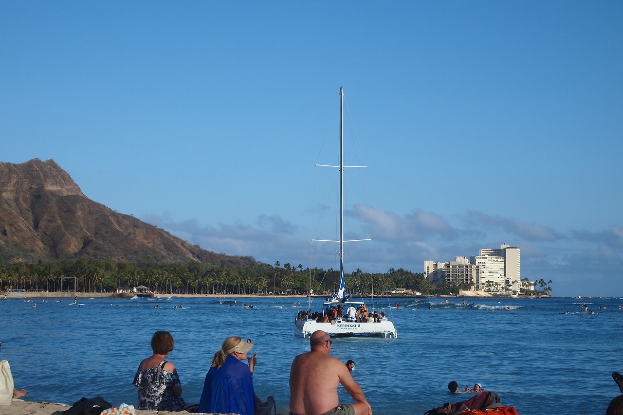 숙소에서 잠시 휴식하다가 이른 저녁에 와이키키 바닷가로 걸어서 나갔다. 이 시간의 해변의 모습이 궁금했다. 쉐라톤 와이키키 호텔 근처에 가까이 정박한 요트 배를 3개나 보았다. 돛을 달고 한배에 20명 이상 거의 수영복 차림으로 타는 걸 보았다. 배가 출발하고 나서도 한참을 해변에 앉아서 먼 바다에 떠있는 그 배를 보았다. 내일은 저배를 타야겠다고 생각했다.