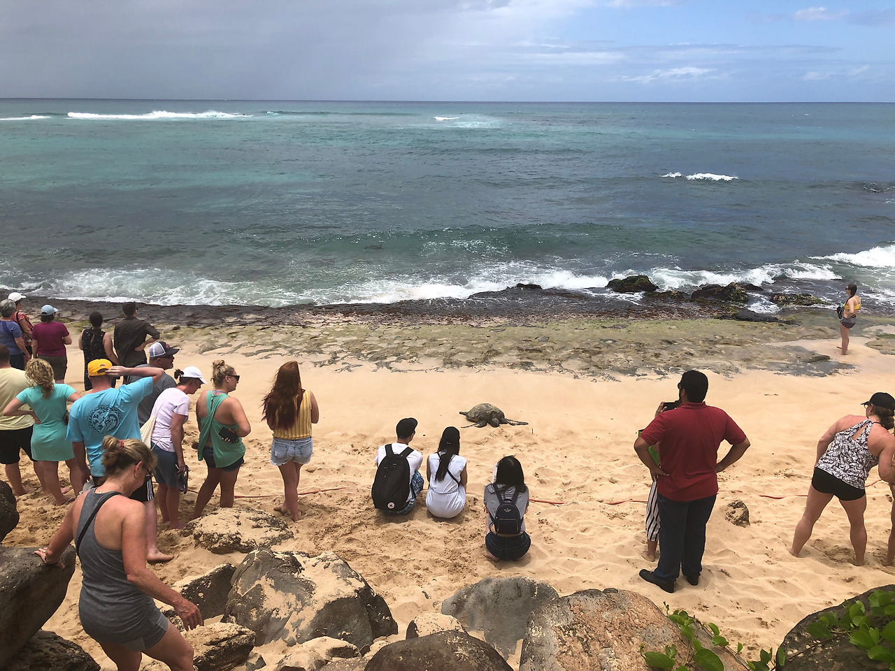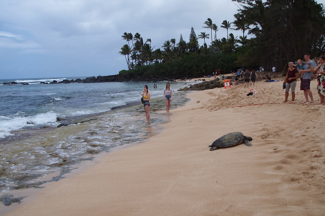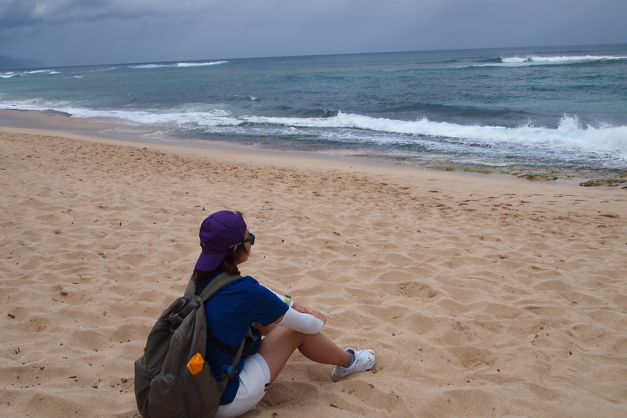 차로 호놀룰루 city에서 한 시간 서북쪽 끝으로 갔다. 파도가 꽤 높아 보이는 Laniakea beach에 도착해서 도로가에 주차하고는 사람들이 모여있는 곳에 합류했다. 시간이 지난 걸까 거북이들이 다 파도 속으로 들어가고 한 마리만 남아있었다. 여행객들 모두들 거북이들이 파도 속에서 수영하는 걸 보았다. 백사장의 끝부분 파도 속에서 많은 숫자의 거북이가 보였다. 마치 남은 한 마리를 기다리는 것처럼 보였다. 거친 파도 속으로 거북이가 들어가는 모습이 여행객들의 흥미를 유발했다.