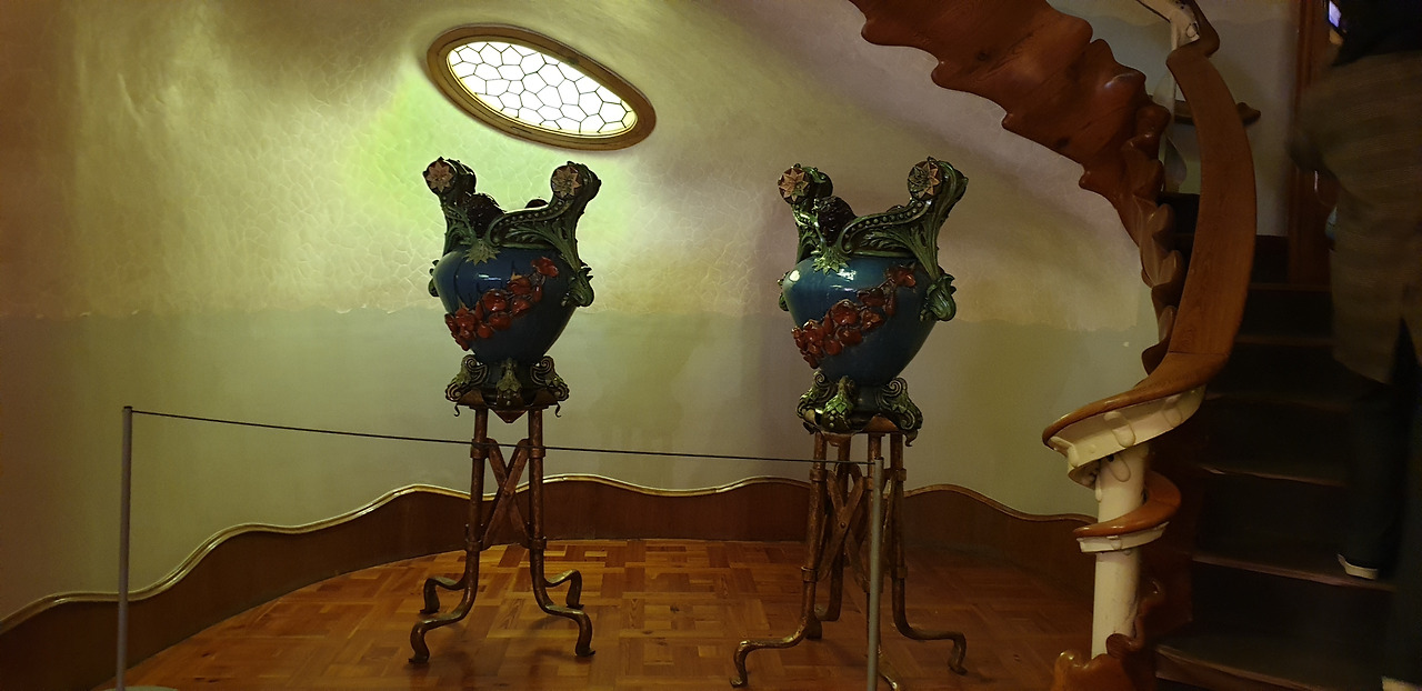 가우디는 곡선의 미를 여기저기 곳곳에 활용하며 설계한 걸 볼 수 있었다. 계단도 문틀도 창틀도 천장 등 곡선으로 모든 곳에 활용되었다는 것이 보였다. 아치형 지붕과 타원형 창문과 구불구불 한 선을 이용한 건물 내부에서도 독특함을 볼 수 있었다. 내부는 옥상 다락방 2층 노블레 층을 구경할 수 있었다. 카사 바트요 내부를 감상하던 중에 예쁜 기념품 점도 볼 수 있었다. 정말 아쉽게도 비와 바람 때문에 카사 바트요 건물 밖에 그 아름 다운 조명을 밝히는 밤에는 볼 수 없었다. 다음 기회에는 꼭 감상할 수 있을 것 같았다. 여운을 많이 남기던 이 도시에서의 며칠을 마음속에 간직하고 있다.