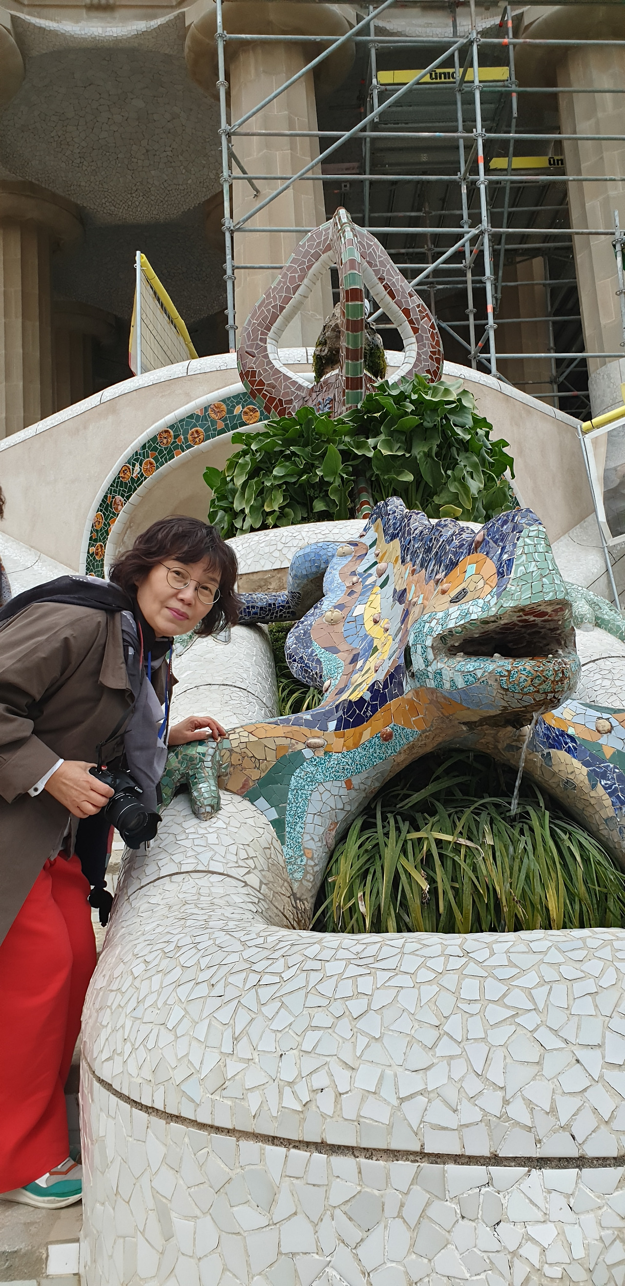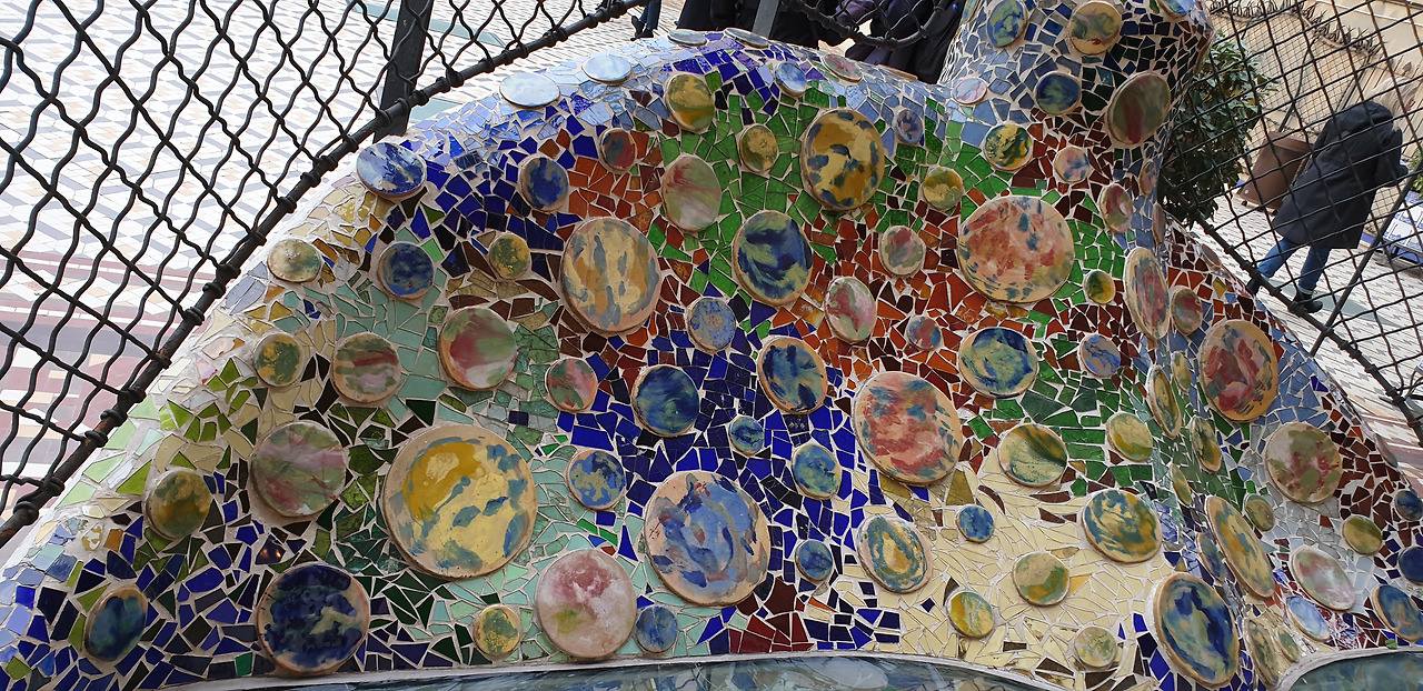 유난히도 가우디의 타일 작품이 많이 보였고 기하학적인 설계에 의한 기둥도 볼 수 있었다. 이 구엘 공원이 지어질 때에 시내에서 멀리 떨어진 언덕을 한참 올라야 나오는 이곳을 부자들이 외면했었기에 단 2채만 분양이 되는 상태였다고 했다. 구엘과 가우디가 부자들을 위한 동네를 계획했었다고 했다. 옥상처럼 넓은 장소로 올라갔다. 가장자리에 인체공학적인 여러 개의 기다란 벤치들의 타일 장식이 돋보였다. 타일을 전부 조각조각 깨트려 장식을 하는 게 가우디의 독창적인 건축 기법이었다고 했다. 구엘 공원 안에 도마뱀 분수대의 타일 장식이 가우디의 타일 양식 중 가장 유명하다고 했다. 그 타일 장식이 멋진 도마뱀의 오른쪽의 손을 만지며 소원을 빌면 꼭 이루어진다는 얘기도 들었다.