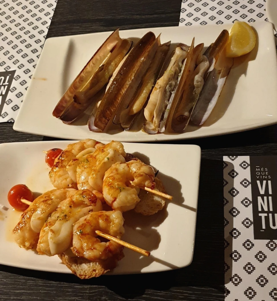 스페인 바르셀로나의 인기 있는 음료 클라라와 새우 감빠스