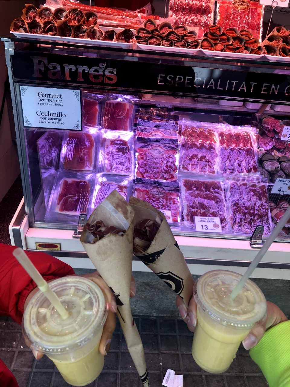 돌아오는 날에 다시 고딕지구 지나는 길에 보케리아 시장에서 과일 망고 주스와 소포장 하몽.