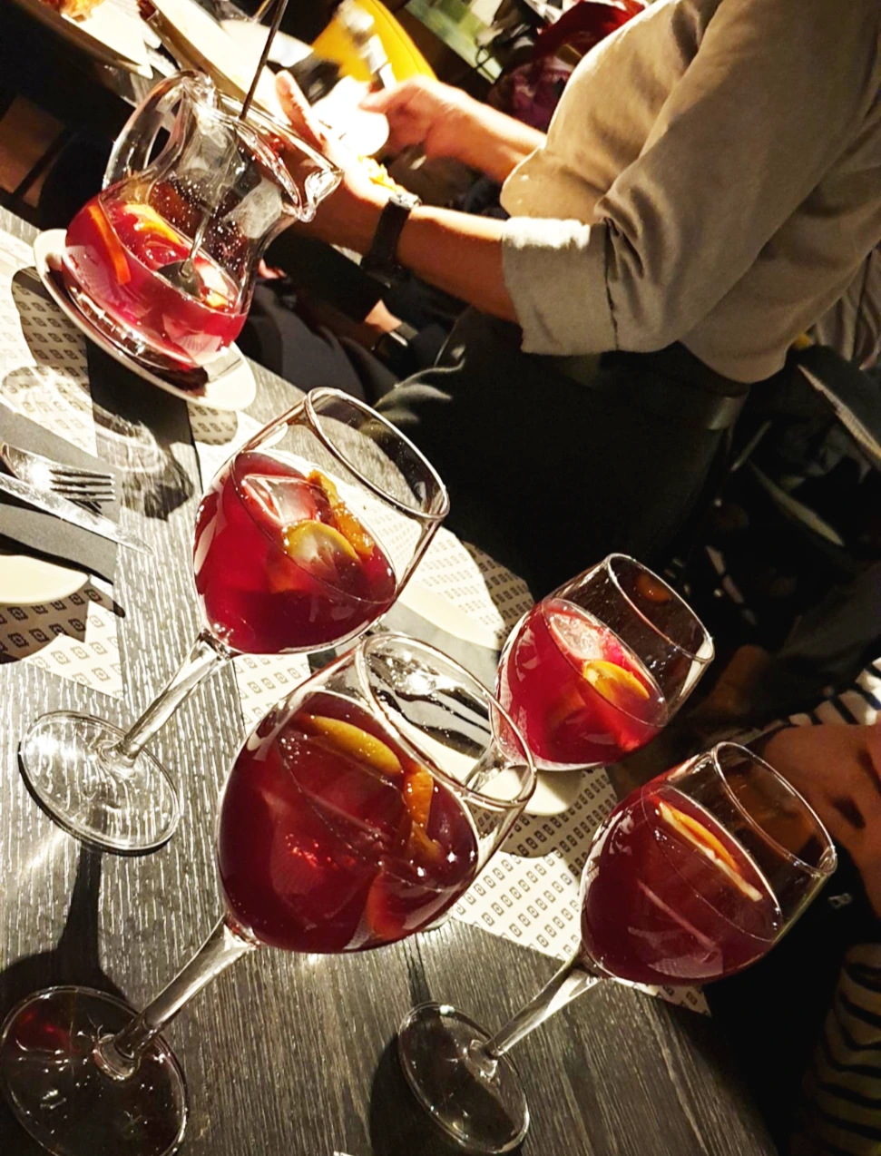 그 sangria샹그리아가 나에게 매력을 뿜어내는 것 같았다. 와인에 과일류를 첨가한 스페인의 전통적인 가정 음료였다. 바로 인터넷에 검색해보니 레드와인에 소다수를 넣고 과일을 썰어 넣고 3시간 정도 숙성된 것이라는 안내를 보았다. 최근에는 스페인에서도 파티나 행사에서 인기가 높다고 했다. 와인이 있어도 맛이 없어서 안 먹던걸 활용해서 해봐야지 생각하고 함께 저녁을 먹었다. 바르셀로나 그라시아 거리에서 멀지 않은 이 식당에서 정말 좋은 사람들과 함께 이런 투어를 하면서 또 먹고 싶던 음식과 샹그리아였다.