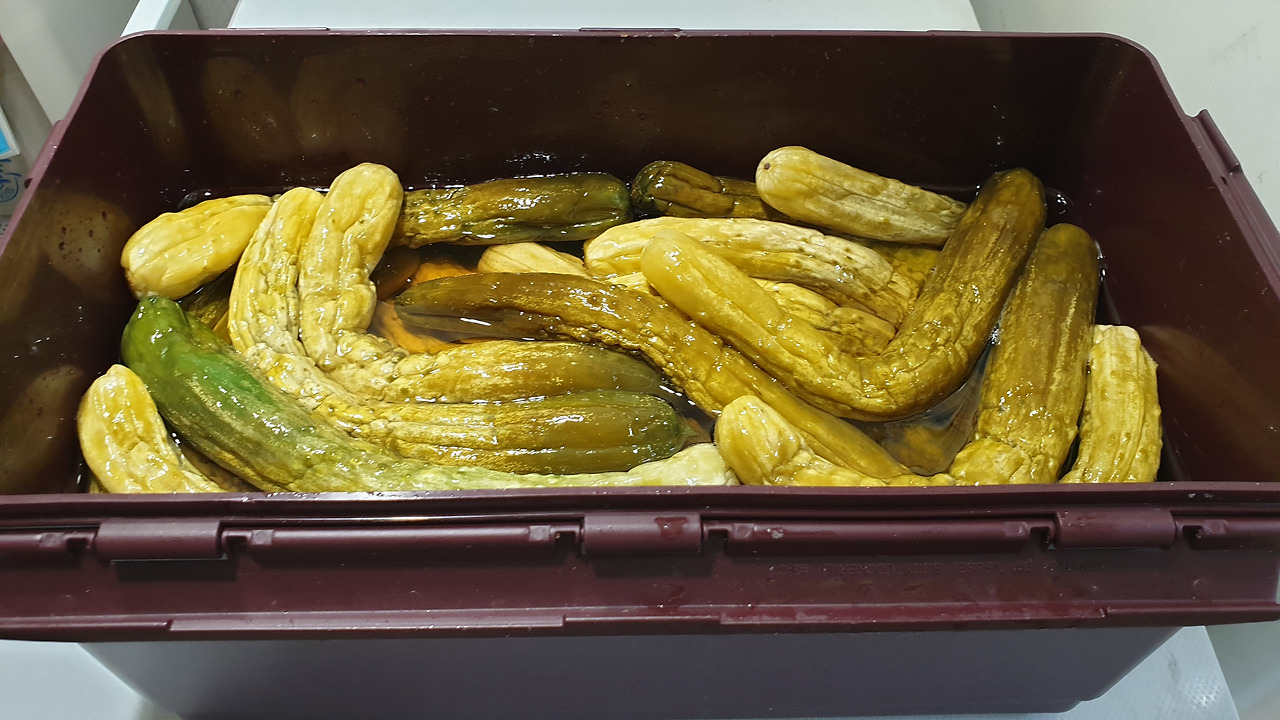 그런데 오이 50개에 굵은소금과 설탕 그리고 식초를 덮고 2 - 3 일 뒤에 뒤집고 나서는 모든 오이가 그 액체 속에 아주 잘 있었다. 돌로 누르지 않아도 맛있었다. 김치 냉장고 안에 넣어 두면 장마철이나 배추김치 없을 때 훌륭한 반찬이 되었다.