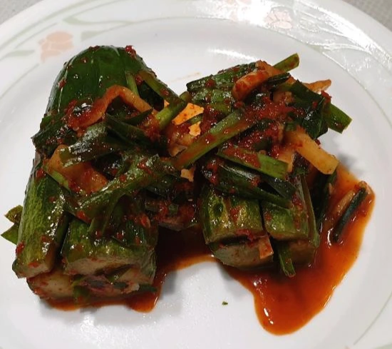 약간의 소금과 버무린다. 오이를 씻어서 건조한 뒤 준비한 부추와 무로 오이의 십자 모양에 채운다. 하루쯤 뒤에 먹을 수 있다. 냉장 보관해야 한다.