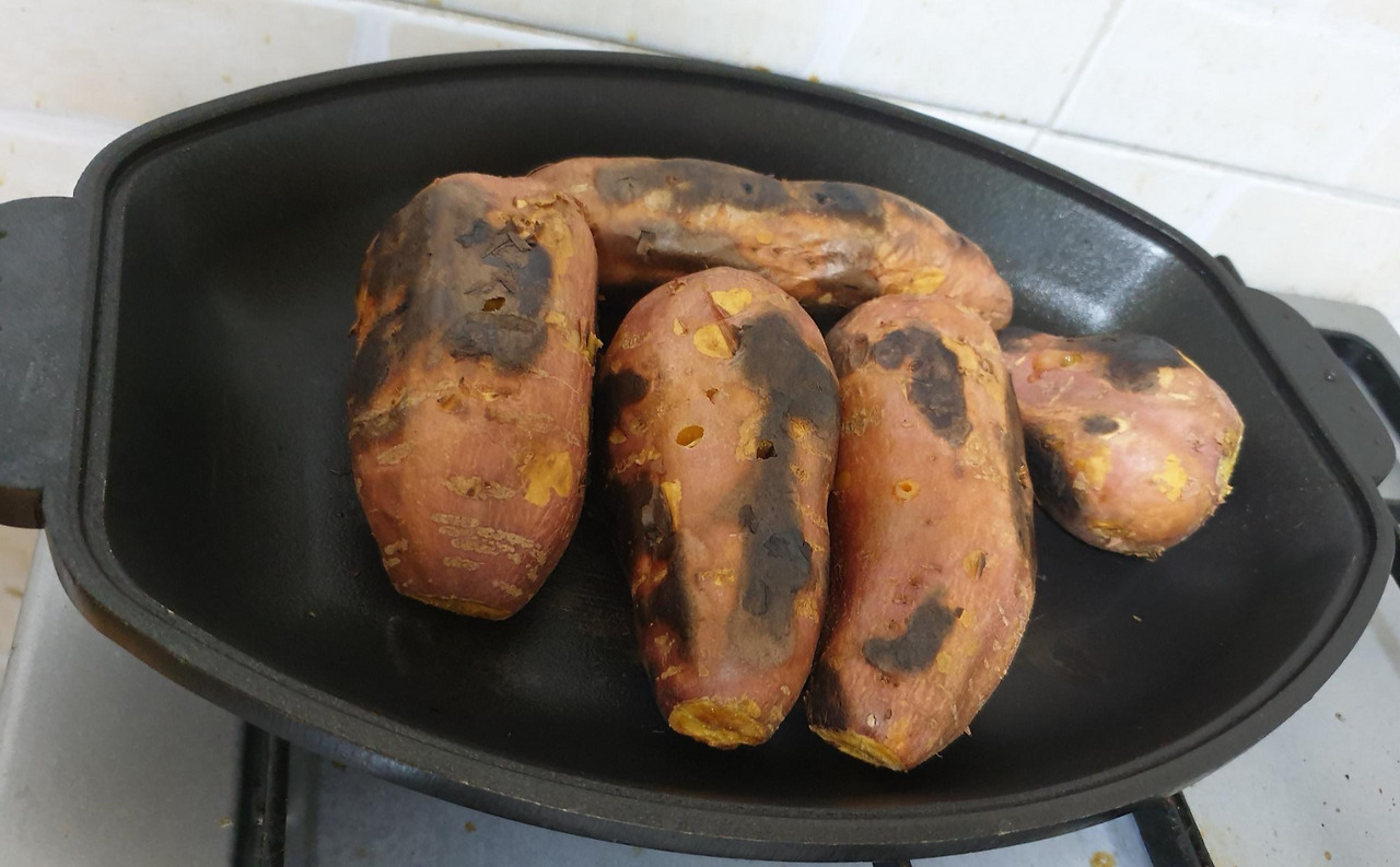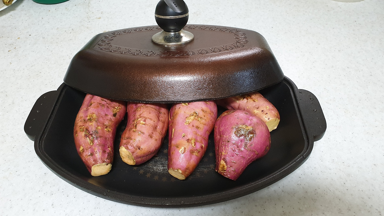 그냥 사과처럼 깎아서 날것 상태로 먹어도 맛있는 호박고구마는 군고구마를 만들 수 있는 조리기구에 넣고 뚜껑을 닫고 익힌다. 그런데 약 7분에 한 번씩 뒤집고 또 뒤집어서 전체가 골고루 익을 수 있게 해야 한다. 그리고 또 뚜껑을 닫아서 잘 익을 수 있게 한다. 조리시간을 거의 30분 정도로 비슷하다. 밤고구마에는 없는 젓가락으로 익었는지 확인한 동그란 투명한 점이 보인다. 다 익었을 때 불을 끄고 뚜껑을 5분 정도 열지 말고 뜸을 들인다.