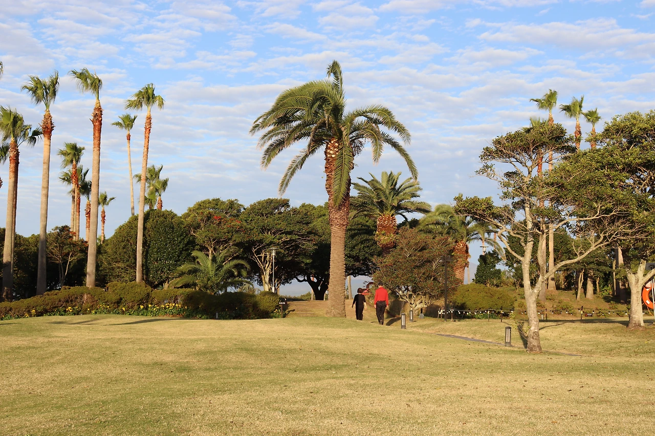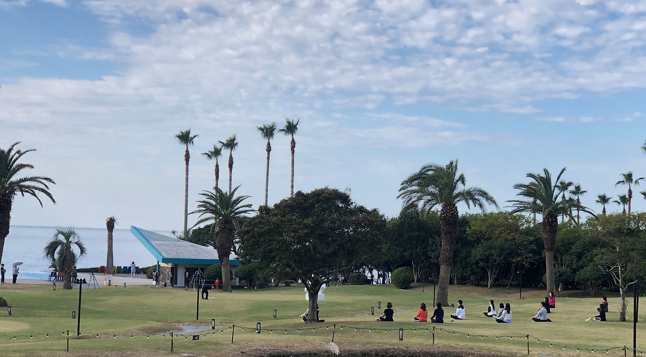 제주에서 우도 섬에 갔다가 와서 그날 저녁은 흑돼지 오겹살을 맛나게 먹고 제주 서귀포시 표선면 일주동로의 소노캄 제주라는 리조트로 갔다. 저녁노을 보며 산책하고 잘 쉬었다. 제주의 남쪽 지역에 있는 그 리조트는 주로 가족동반들이 많고 가끔 동호회들의 모습도 보였다. 대부분 차근차근 얘기하며 남을 배려하는 여유 있는 몸짓들이었다. 다음날 아침 일찍 산책하며 가까이에 올레길 4코스가 연결된 걸 보았다. 리조트의 조식 뷔페가 입맛을 당기게 해서 한 접시 두 접시 세 접시나 비우고도 커피와 디저트를 먹었다. 그리고 야자수 나무가 예쁜 산책길도 사진으로 남기며 넓은 리조트를 다시 들러 보았다. 잠깐 다른 곳에 있는 동안 요가 동호회가 나와서 요가를 했다고 들었다.