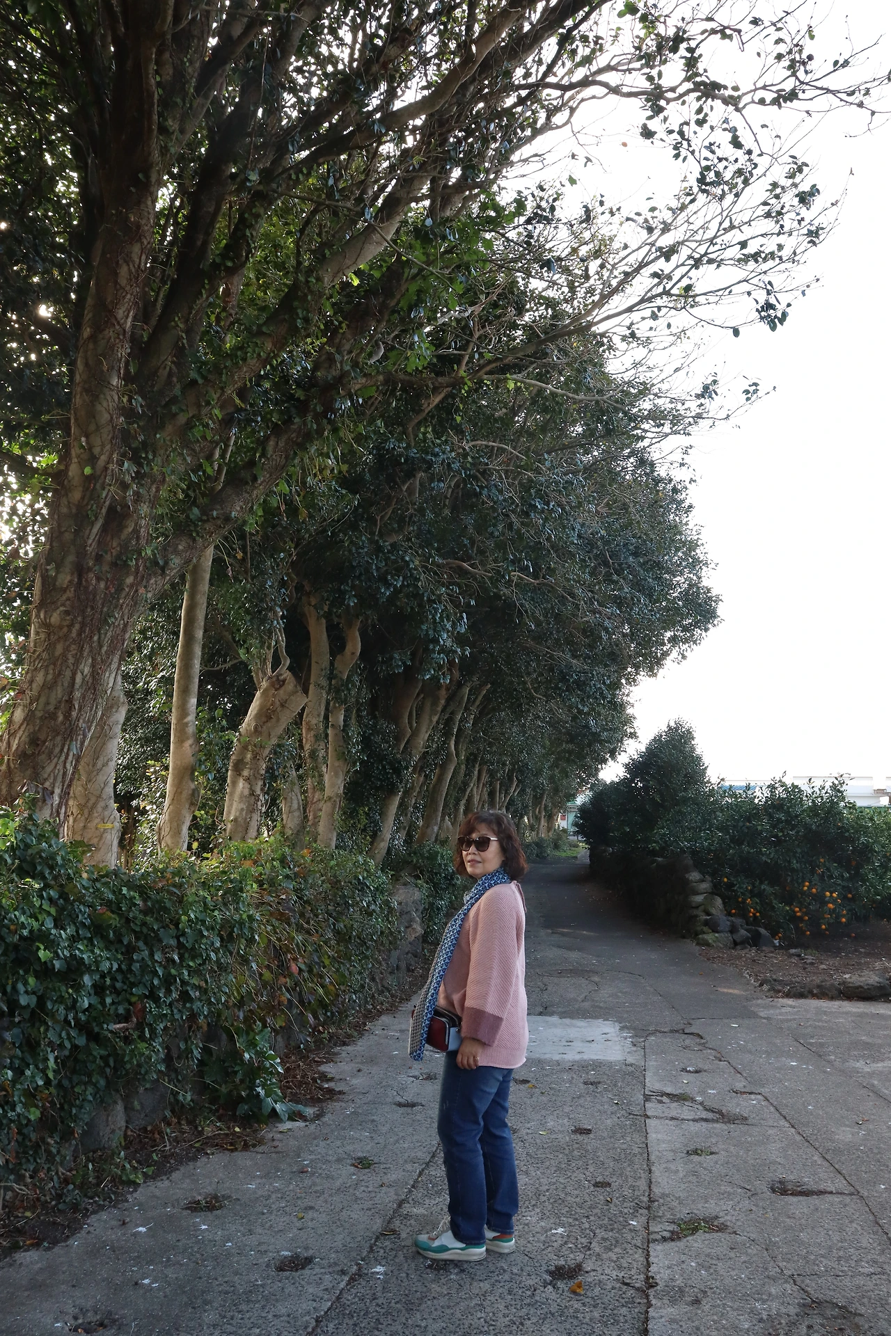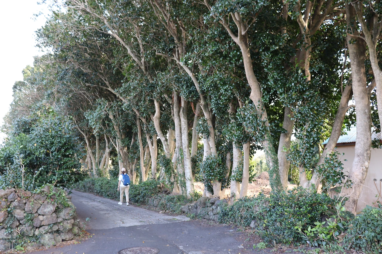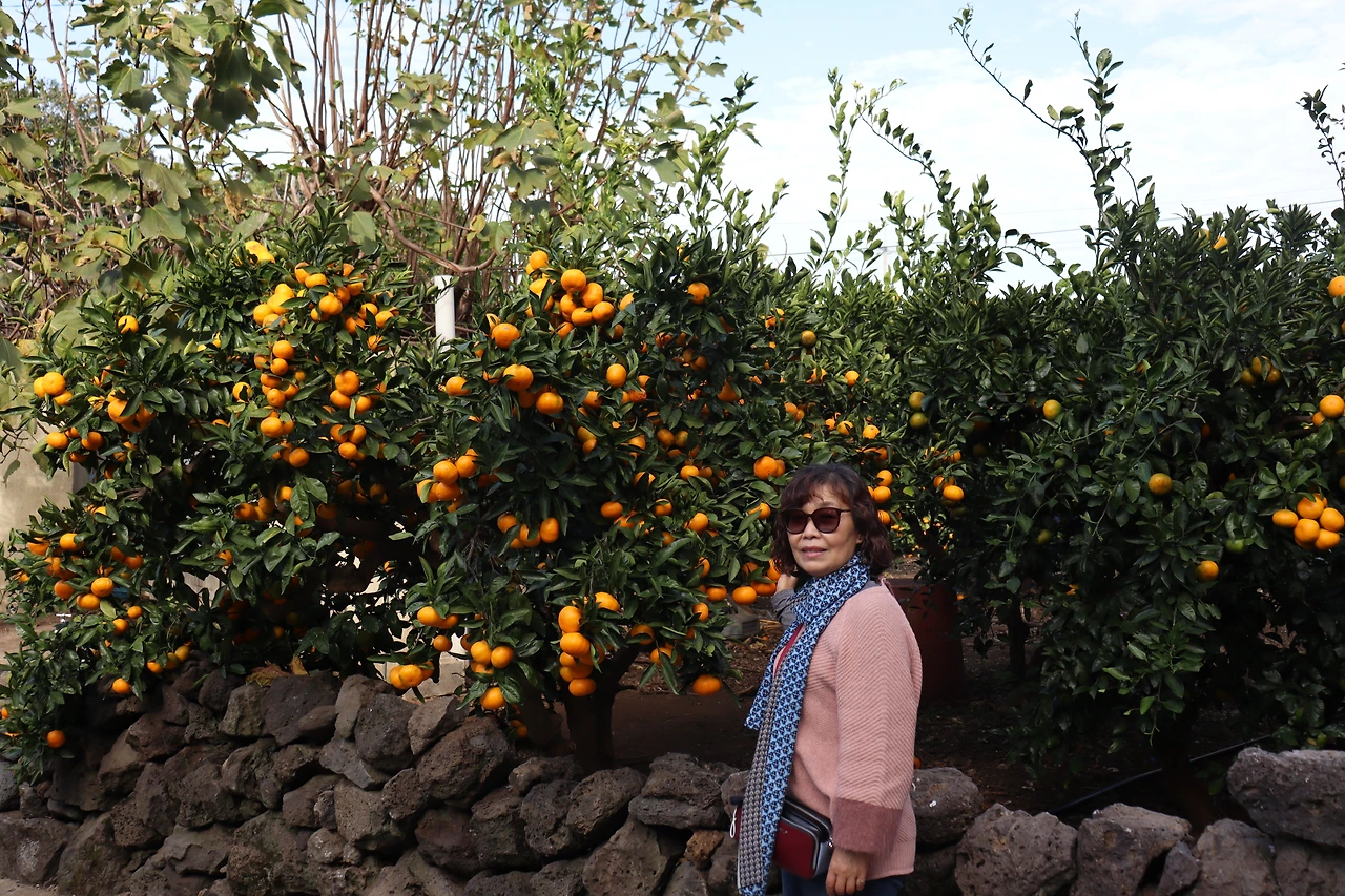 그리고 차로 이동해서 제주의 위미 동백나무 군락지를 찾아서 가보았다. 가장자리로는 큰 동백나무들이 있고 안쪽으로는 작은 동백나무들이 심어져 있는 걸 볼 수 있었다. 제주의 기후에서 잘 자라는 특성이 있나? 주변을 걸으면서 보이는 귤나무들이 무거울 정도로 귤을 많이 가지고 있었다. 감탄사가 저절로 나왔다. 어머나 , 귤나무들 봐!나무에 귤이 매달린 모습을 보기만 해도 배가 부른 느낌이었다. 두리번거리며 귤나무들을 충분히 감상한 후에 모노클이라는 유명한 카페로 가서 약간의 더위와 목마름도 식힐 겸 해서 야외의 테이블에 앉아서 시원한 커피도 마셨다.