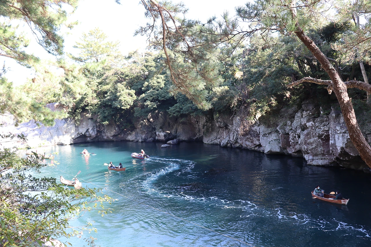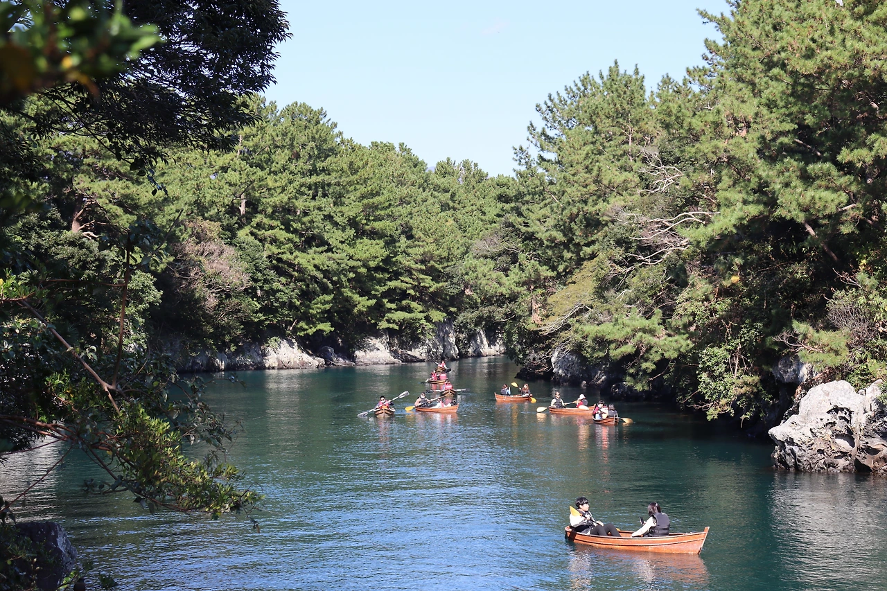 오늘은 쇠소깍에 갔다가 올레길도 6코스 7코스를 가려고 준비하며 나갔다. 서귀포시 하효동과 남원읍 하례리 사이를 흐르는 효돈천 하구이며 제주 현무암 지하를 흐르는 물이 분출하여 바닷물과 만나 깊은 웅덩이를 형성한 곳이었다. 쇠소깍은 제주도 방언이며 쇠는 효돈 마을을 뜻하며, 소는 연못, 각은 접미사로 소 끝을 의미한다고 했다. 아래로 내려다보는 그곳 쇠소깍의 모습은 초록빛의 투명하다시피 한 기다란 연못에서 카약에 둘이 타고서 뱃놀이하는 모습이었다. 보기만 해도 멋진 자연과 어우러지는 이 모습을 아마도 오래전 제주에 왔을 때 보았던 기억이 있다. 쇠소깍 주의에 데크가 잘 되어 있어서 걷기도 하며 중간중간 전망대로 뱃놀이 모습을 볼 수 있었다.