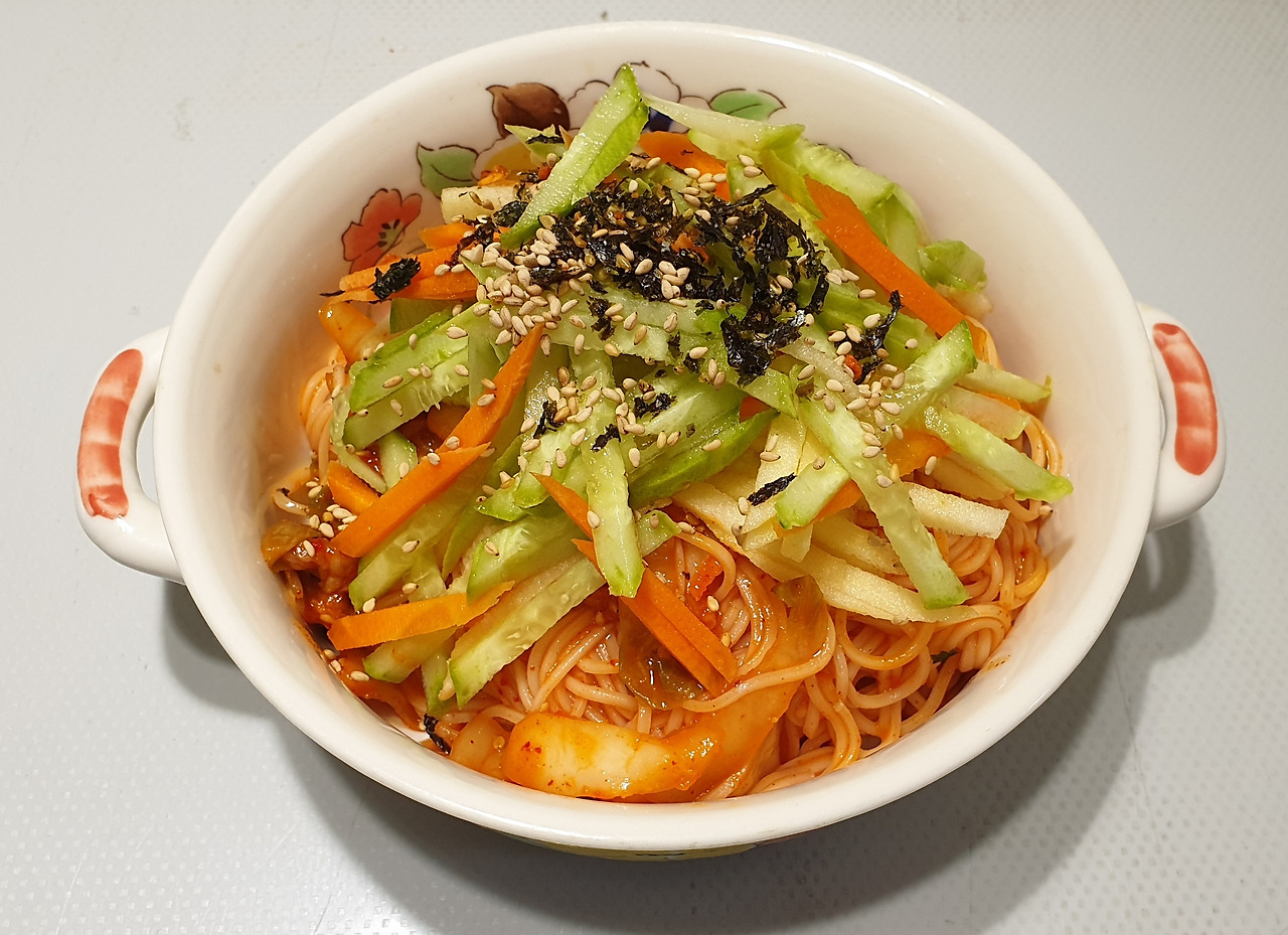 유난히 국수를 좋아하는 가족을 위해서 만들기는 참 번거로운 음식이라고 말하기도 한다. 단시간에 후루룩 하며 먹는 것에 비하면 조리 과정이 귀찮기 때문이다. 예를 들어 비빔국수를 만들기를 하자면 우선 소면을 구입해야 한다. 포장되어 있는 말린 국수는 중면도 있고 소면도 있기에 비빔국수용으로는 소면이 적당하다. 우선 물을 끓여서 소면을 삶아서 그리고 비빔국수를 마치 비빔밥처럼 마구 넣고 비빈다?