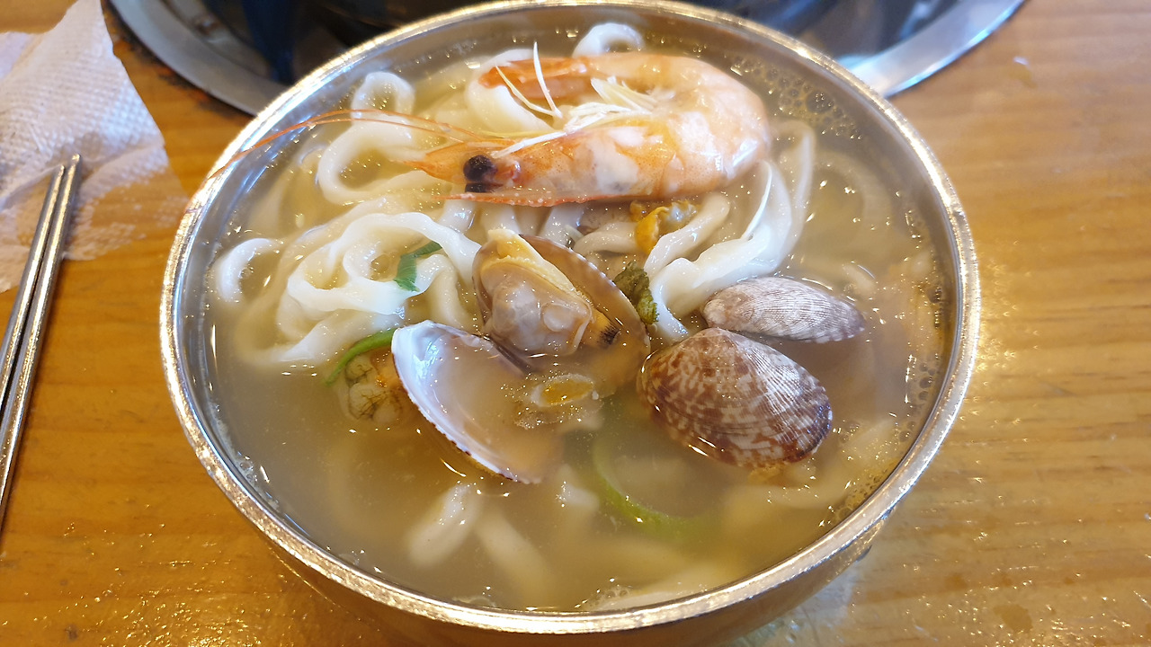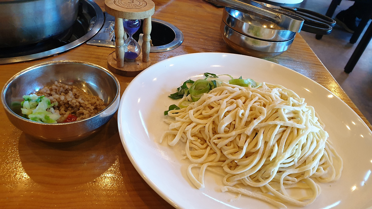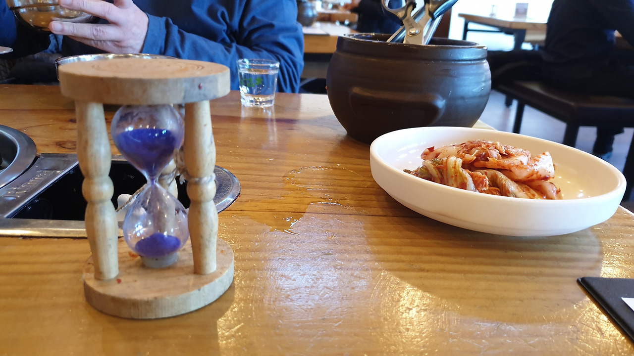 종업원이 육수가 끓으니 와서 칼국수를 넣고 저으면서 커다란 뚜껑을 닫고서 옆에 모래시계를 놓고 가면서 이렇게 말했다. "이 모래시계가 다 떨어지면 드시면 됩니다" 테이블마다 모래시계는 크기가 달랐다. 그 시원하고 맛있는 육수 국물을 식탁에서 보면서 끓여서 그 식당에서 직접 만들어 놓은 쫄깃한 맛의 칼국수를 넣고서 다시 끓여서 먹을 때 반찬의 궁합은 김치와 짝꿍이었다. 후루룩 먹고서 만두를 리필해서 넣고 끓이니 금세 육수의 맛이 달라졌다. 칼국수만 넣고 끓인 게 더 시원한 맛을 냈다.