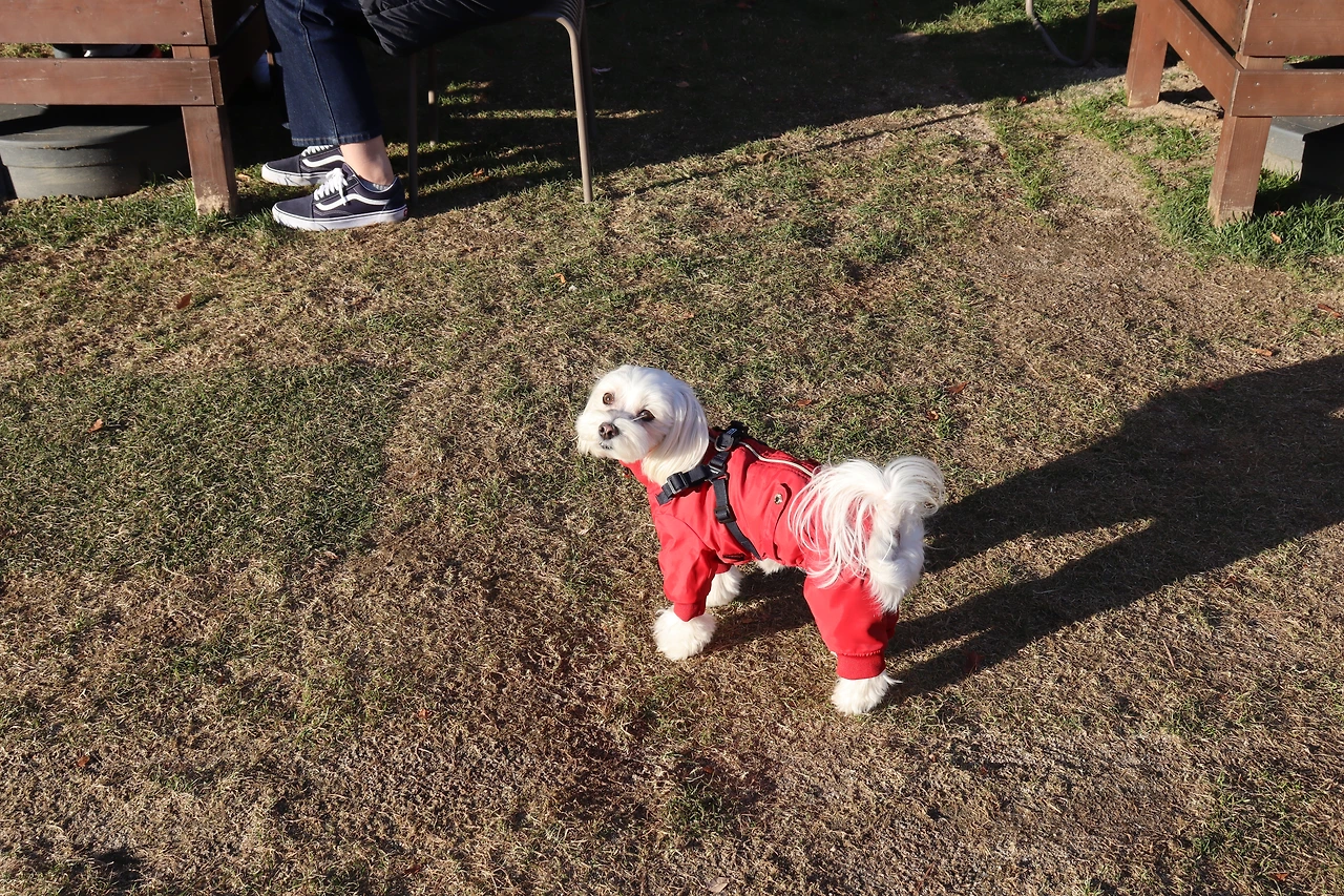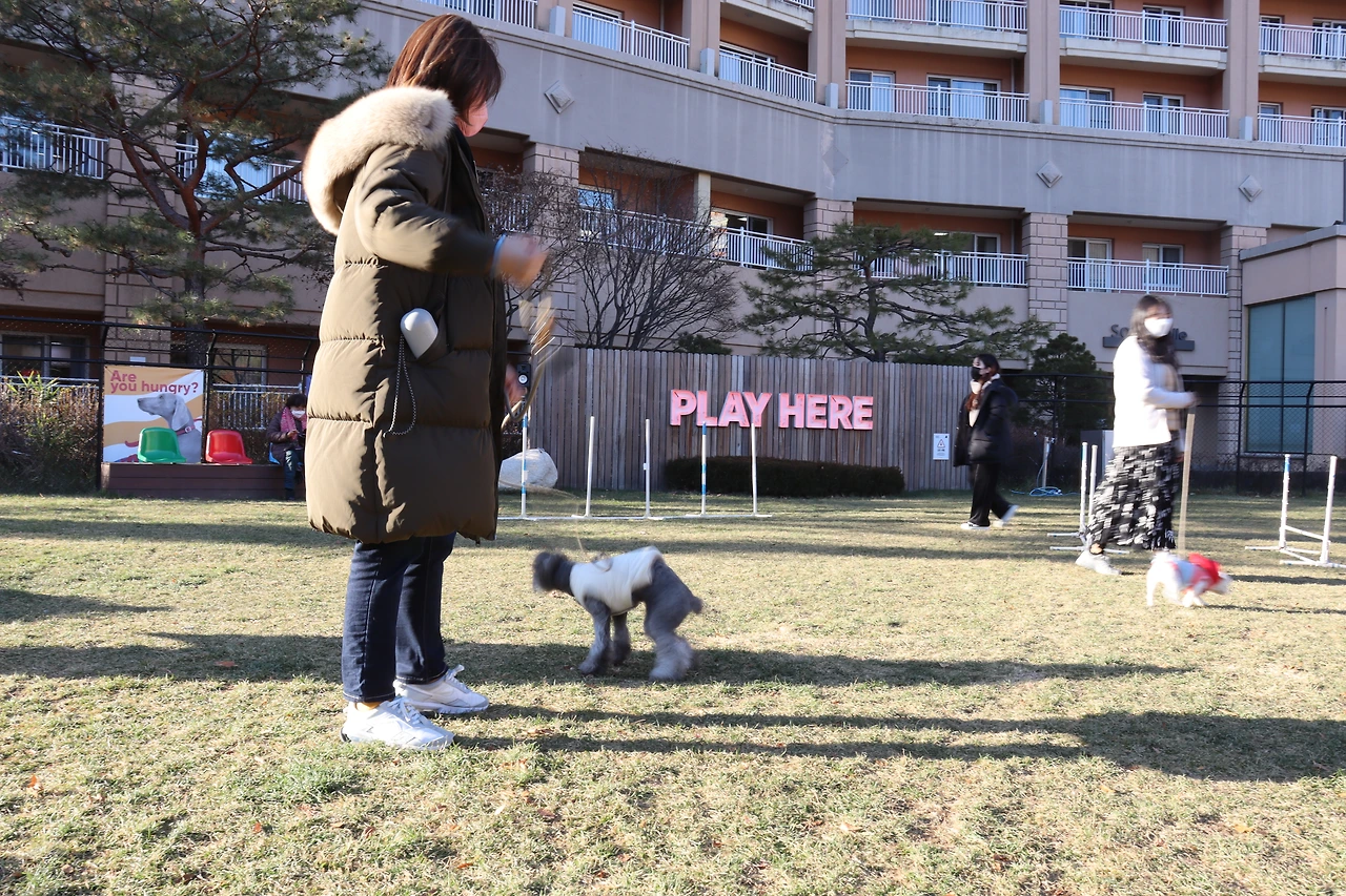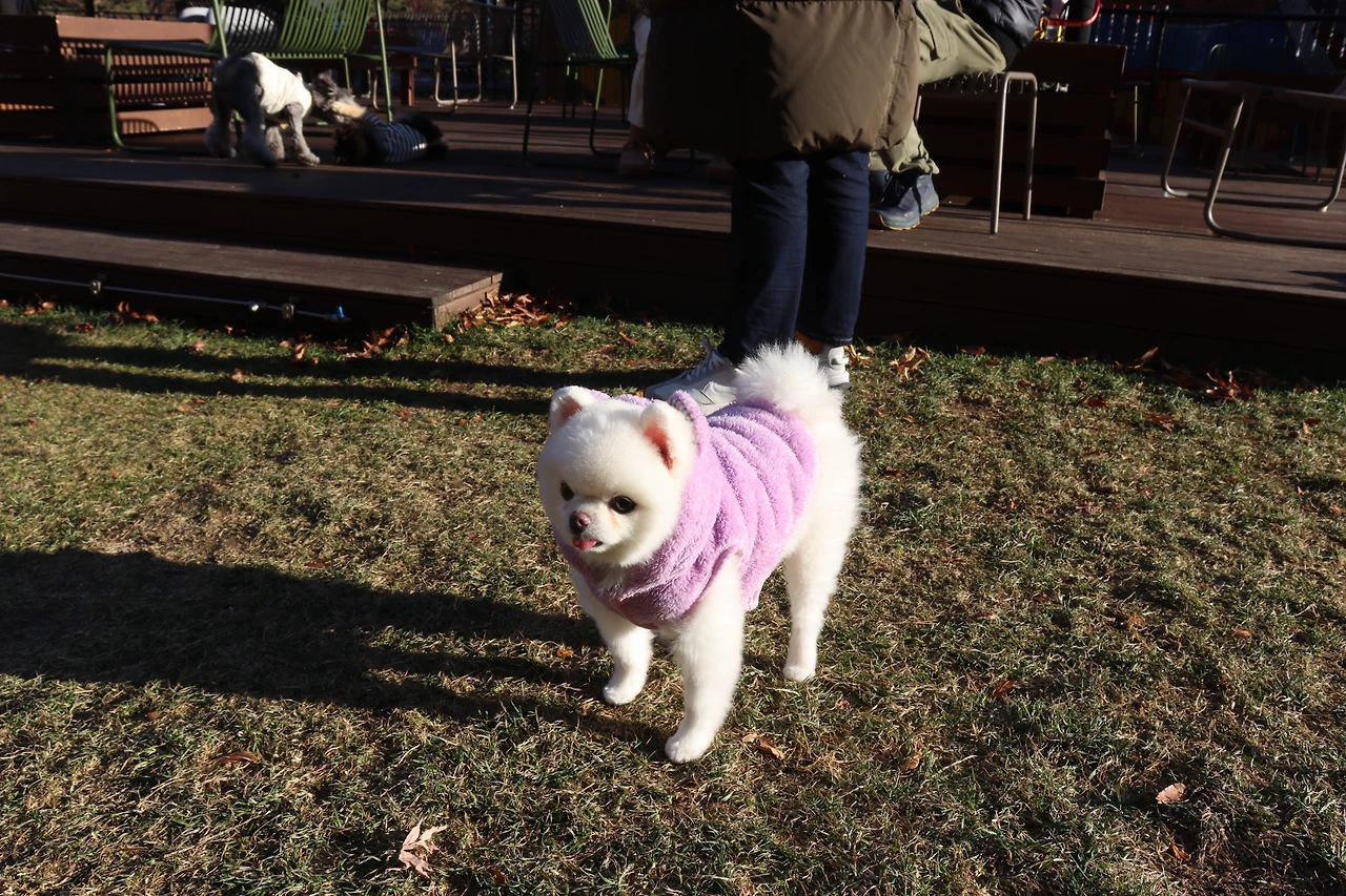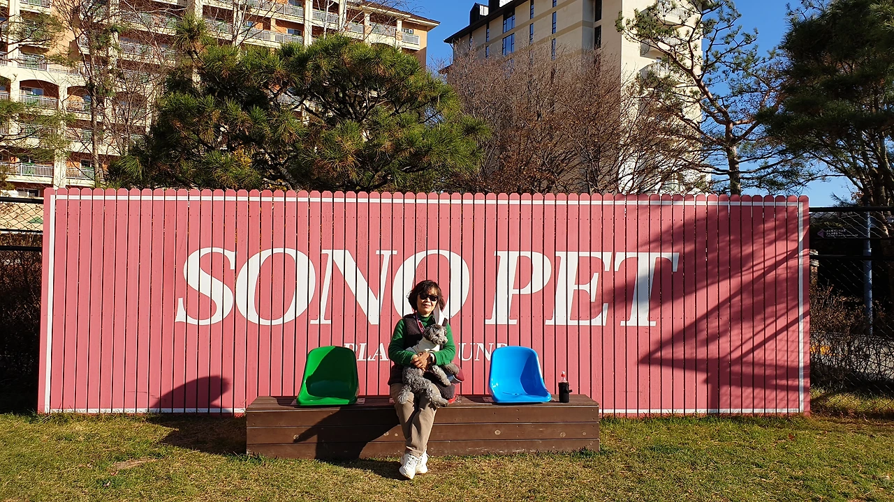 강아지가 쉬를 하면 뿌려야 하는 각자 들고 다니는 액체병이 있기 때문이었다. 애견놀이터에는 자유로움과 규칙이 있었다. 12월 초에 날씨는 쌀쌀했지만 강아지도 뛰고 주인들도 뛰고 하는 걸 보았다. 작은 허들 용품도 주인이 하면 강아지도 따라서 하는 게 보였다. 저절로 웃음이 나오는 장면이었다.편하게 앉아서 웃으며 구경하기에 안성맞춤이었다.