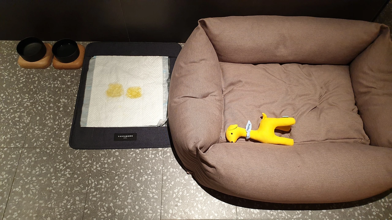 객실로 가는 엘리베이터를 내리자 조명은 아주 어둡게 되어 있었다. 복도는 대부분 짙은 회색이었고 객실 문은 검은색이었다. 들어가자마자 바로 애견 침대, 배변패드, 사료통이 자리 잡고 있었다. 객실 내부는 밝은 LED 전구 등은 없고 백열 등색으로 어둡게 되어있었다. 객실 바닥은 타일로 되어 있고 소파는 애견을 위한 마루시공이 대부분이었다. 객실에서 내려다 보이던 애견 놀이터는 꽤 넓어 보였다.