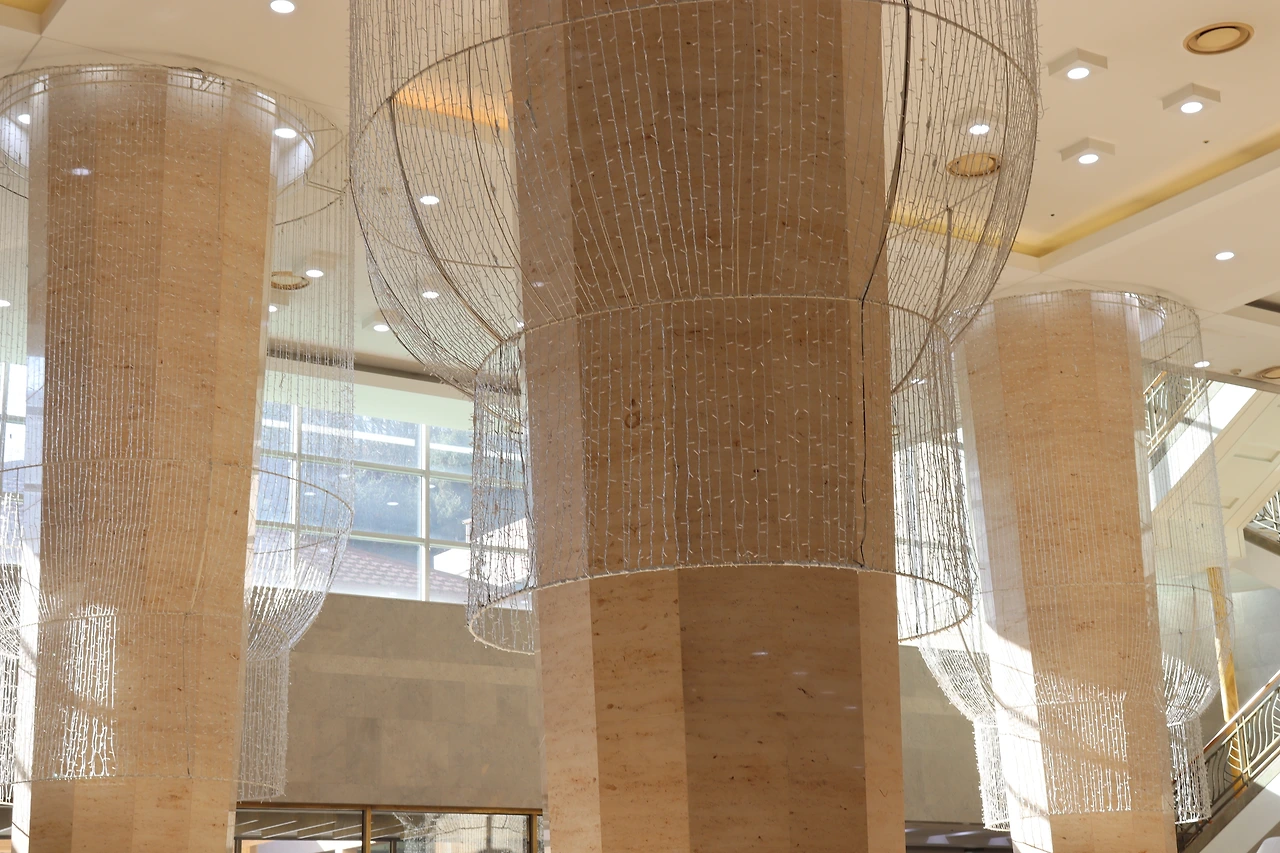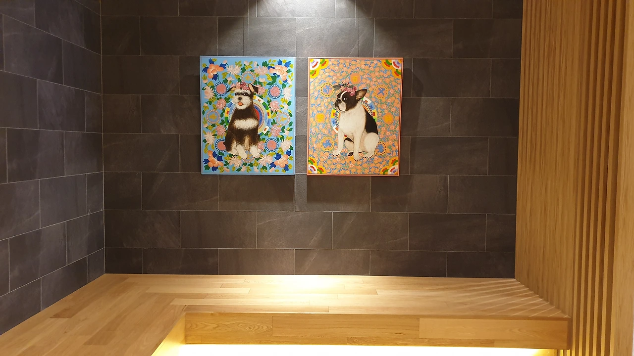 호텔 체크인 과정에 애견에 대한 것도 포함하고 있었다. 예방접종을 했다는 표시를 하는 목줄을 제공했다. 로비에 소파나 그런 건 없고 그냥 넓디넓은 공간이었다. 호텔 내부에는 애견을 위한 것들로 복도에도 엘리베이터에도 객실에도 갖추어져 있었다. 애견을 위한 작은 사진관 시설도 있었다. 그리고 객실로 가는 복도의 벽면에는 강아지들의 그림들이 대부분이었다.