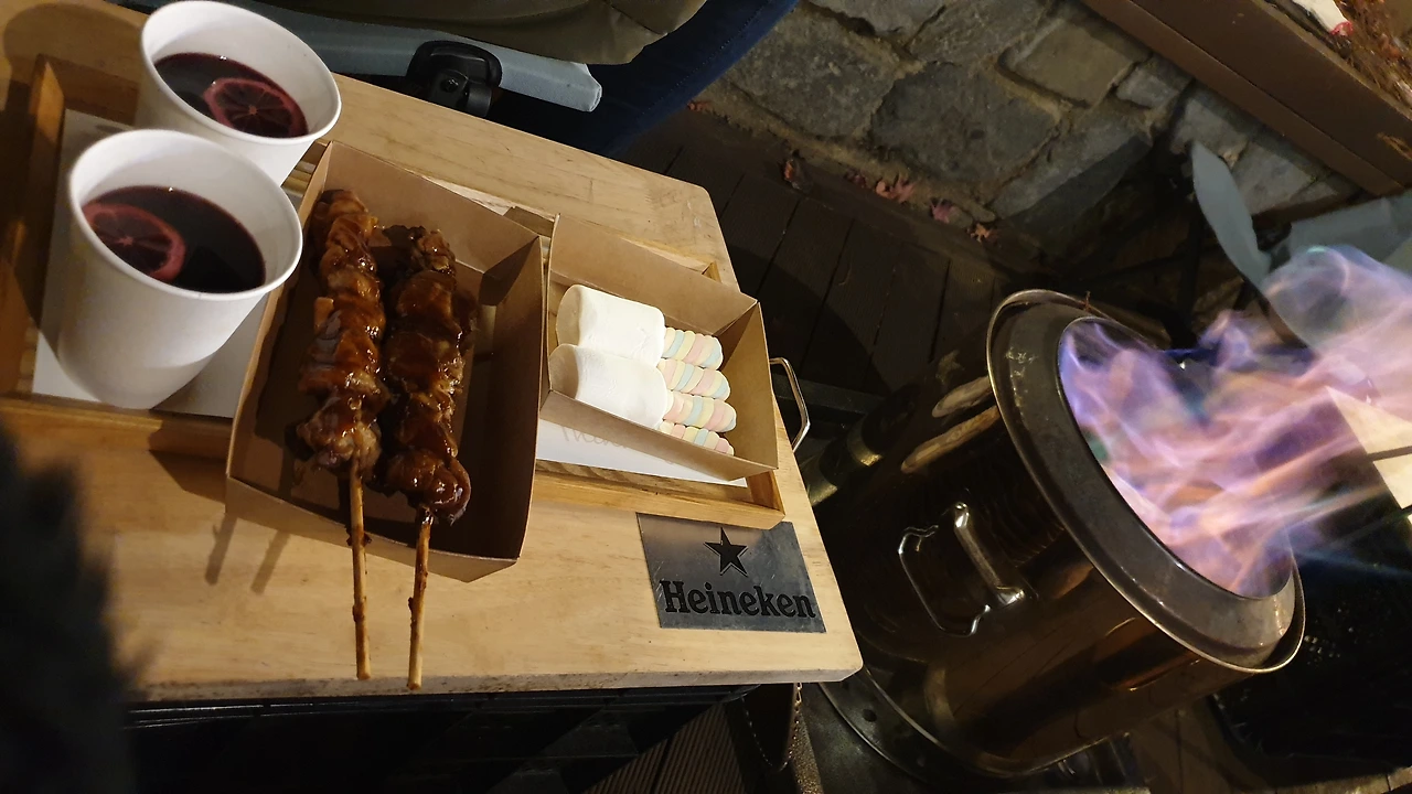 밤이 되자 스키를 타던 사람들이 없고 여러 개의 기계들이 마치 분수처럼 눈을 만들어서 쉬지 않고 뿜어내고 있었다. 그 모습을 보고 다음날 스키 타려는 사람들은 흐뭇할 듯했다. 애견놀이터 앞에서는 이벤트를 하고 있었다. 저녁 6시부터 선착순으로 불멍 하며 음식도 먹을 수 있는 자리가 있었다. 낮에 보았던 작은 엔틱 버스는 음식을 만들어서 판매하고 늦게 온 사람들은 기회가 없었다. 자리가 없어도 다시 돌아가지 않은 채 기다리는 모양이었다.